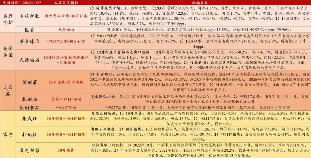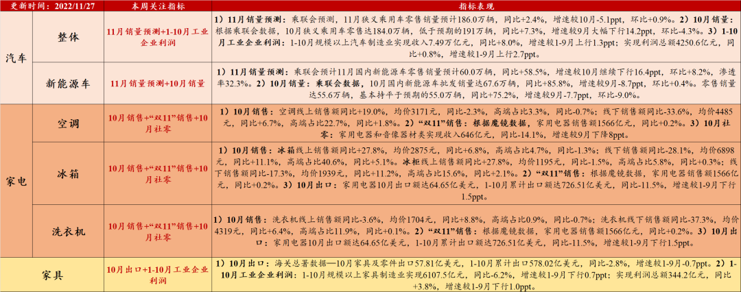 1) 汽车:销量增速预期下行,行业利润维持韧性。a、11月销售预测:乘联会预测,11月狭义乘用车零售销量预计186.0万辆,同比+2.4%,增速较10月-5.1ppt,环比+0.9%。b、1-10月工业企业利润:1-10月规模以上汽车制造业实现收入7.49万亿元,同比+8.0%,增速较1-9月上行1.3ppt;实现利润总额4250.6亿元,同比+0.8%,增速较1-9月上行2.7ppt。2) 家具:家具内外需表现疲弱,行业利润增速下行。a、10月出口:海关总署数据—10月家具及零件出口57.81亿美元,1-10月累计出口578.02亿美元,同比-2.8%,增速较1-9月-0.7ppt。b、10月社零:家具类实现收入144亿元,同比-6.6%,增速较9月上升0.7ppt。c、1-10月工业企业利润:1-10月规模以上家具制造业实现6107.5亿元,同比-6.2%,增速较1-9月下行0.7ppt;实现利润总额344.2亿元,同比+3.8%,增速较1-9月下行1.0ppt。3) 家电:白电10月销售平淡。a、10月社零:家用电器和音像器材类实现社零646亿元,同比-14.1%,增速较9月下降8ppt。b、“双11”活动:根据奥维云网数据,“双11”活动综合电商(天猫/京东/拼多多)实现销售额9340亿元,同比+2.9%,其中空调、冰箱、冰柜、洗衣机销售额同比分别+21.8%、+8.9%、+18.2%和-6.2%。