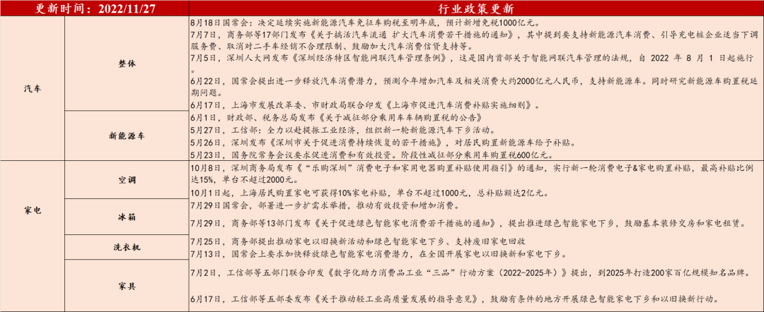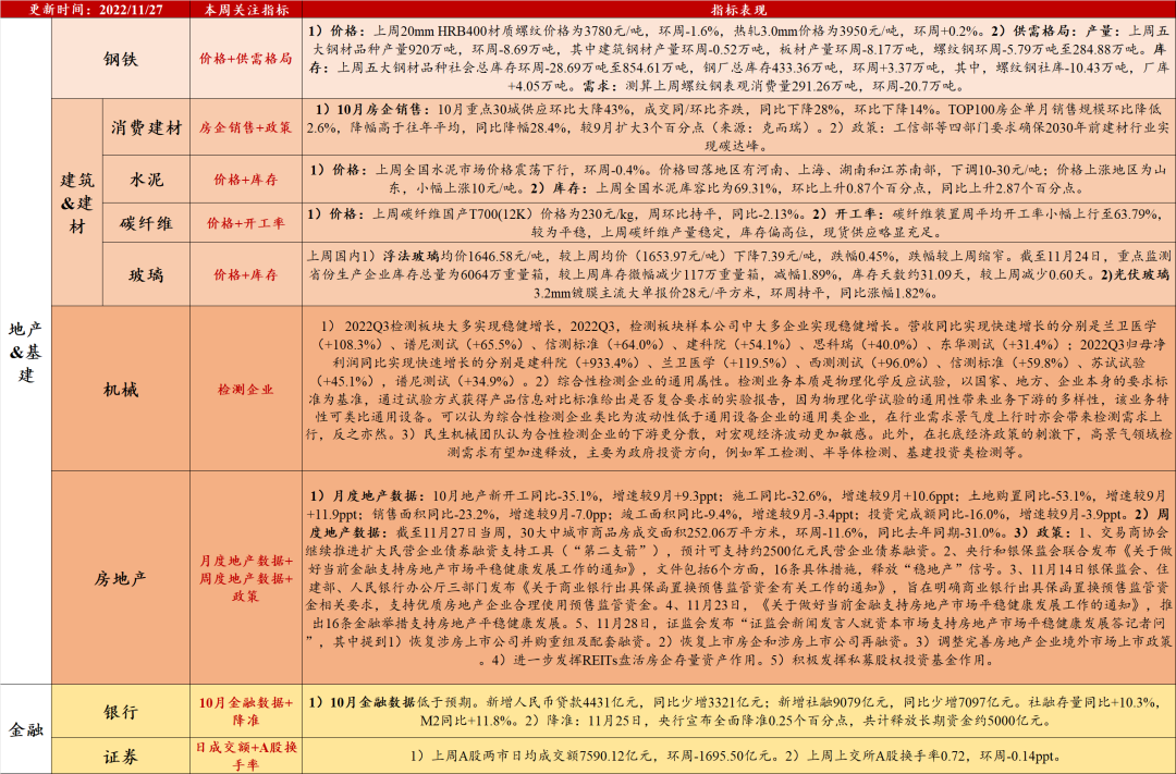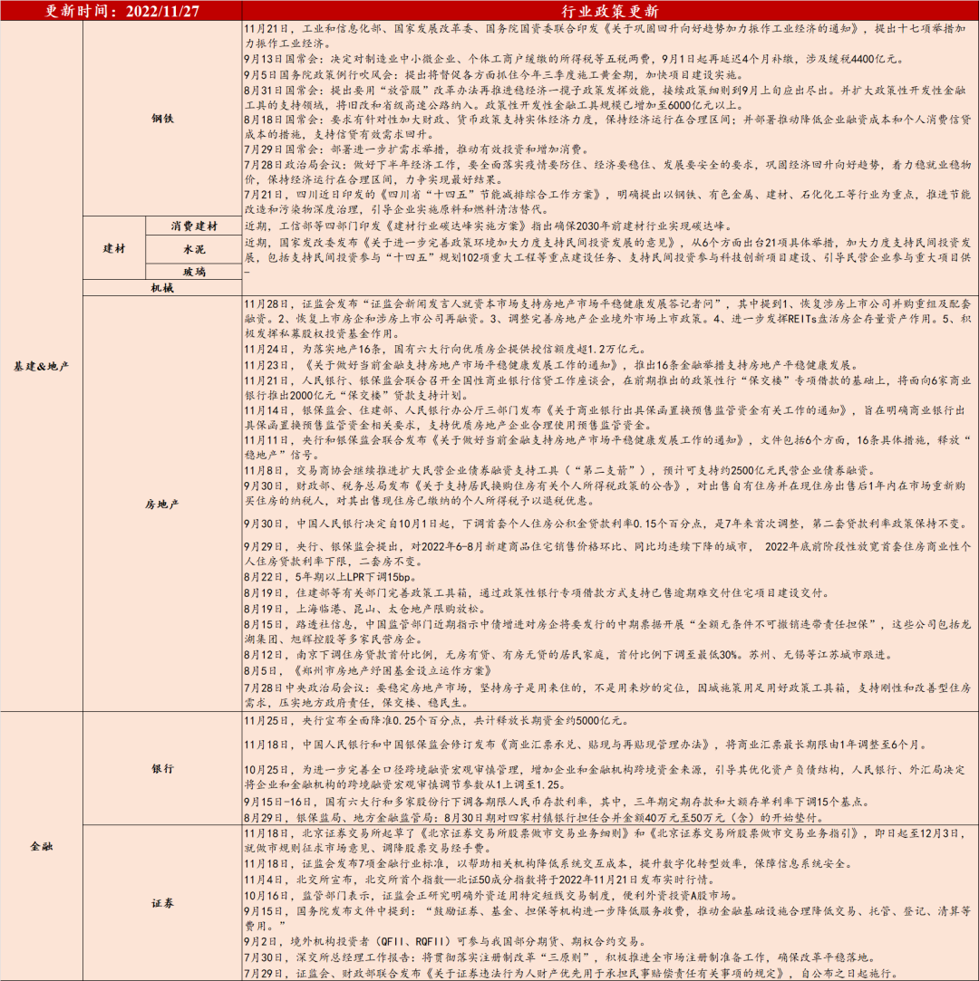 数据来源:各政府官网,民生农业团队数据,民生证券研究院整理1、11月28日,证监会发布的“证监会新闻发言人就资本市场支持房地产市场平稳健康发展答记者问”中提到1)恢复涉房上市公司并购重组及配套融资。2)恢复上市房企和涉房上市公司再融资。3)调整完善房地产企业境外市场上市政策。4)进一步发挥REITs盘活房企存量资产作用。5)积极发挥私募股权投资基金作用。2、11月24日,为落实地产16条,国有六大行向优质房企提供授信额度超1.2万亿元。3、11月23日,《关于做好当前金融支持房地产市场平稳健康发展工作的通知》,推出16条金融举措支持房地产平稳健康发展。4、11月21日,人民银行、银保监会联合召开全国性商业银行信贷工作座谈会,在前期推出的政策性行“保交楼”专项借款的基础上,将面向6家商业银行推出2000亿元“保交楼”贷款支持计划。5、11月14日,银保监会、住建部、人民银行办公厅三部门发布《关于商业银行出具保函置换预售监管资金有关工作的通知》,旨在明确商业银行出具保函置换预售监管资金相关要求,支持优质房地产企业合理使用预售监管资金。6、11月11日,央行和银保监会联合发布《关于做好当前金融支持房地产市场平稳健康发展工作的通知》,文件包括6个方面,16条具体措施,释放“稳地产”信号。7、11月8日,交易商协会继续推进扩大民营企业债券融资支持工具,预计可支持约2500亿元民营企业债券融资。b、全面降准:11月25日,央行宣布年内第二次全面降准,本次降准25bp,共计释放长期资金约5000亿元。2) 房地产:销售、投资维持低位,政策利好不断出台。a、10月数据:10月地产新开工同比-35.1%,增速较9月+9.3ppt;施工同比-32.6%,增速较9月+10.6ppt;土地购置同比-53.1%,增速较9月+11.9ppt;销售面积同比-23.2%,增速较9月-7.0pp;竣工面积同比-9.4%,增速较9月-3.4ppt;投资完成额同比-16.0%,增速较9月-3.9ppt。b、周度销售数据:截至11月27日当周,30大中城市商品房成交面积252.06万平方米,环周-11.6%,同比去年同期-31.0%。3) 钢铁、水泥需求偏弱。受淡季需求回落和疫情防控的影响,钢铁、水泥需求回落。钢铁:上周20mm HRB400材质螺纹价格为3780元/吨,环周-1.6%。上周螺纹钢表观消费量291.26万吨,环周-20.7万吨。根据民生金属团队判断,目前钢铁基本面呈现弱现实强预期的局面,地产端金融支持不断加码,提振钢铁长期基本面预期。水泥:上周全国水泥价格震荡下行,环周-0.4%。根据民生建筑建材团队判断,11月下旬,受下游资金短缺、防控严格,以及降雨降温等多重不利因素影响,国内水泥市场需求量环比继续减弱,企业库存不断攀升,导致水泥价格出现震荡调整行情。整体来看,下游水泥需求提前减弱趋势明朗,再结合各地的相关防控政策,预计后期水泥需求恢复的可能性不大,考虑到各区主导企业仍在开展行业自律,水泥价格多将维持震荡调整走势为主。![]()