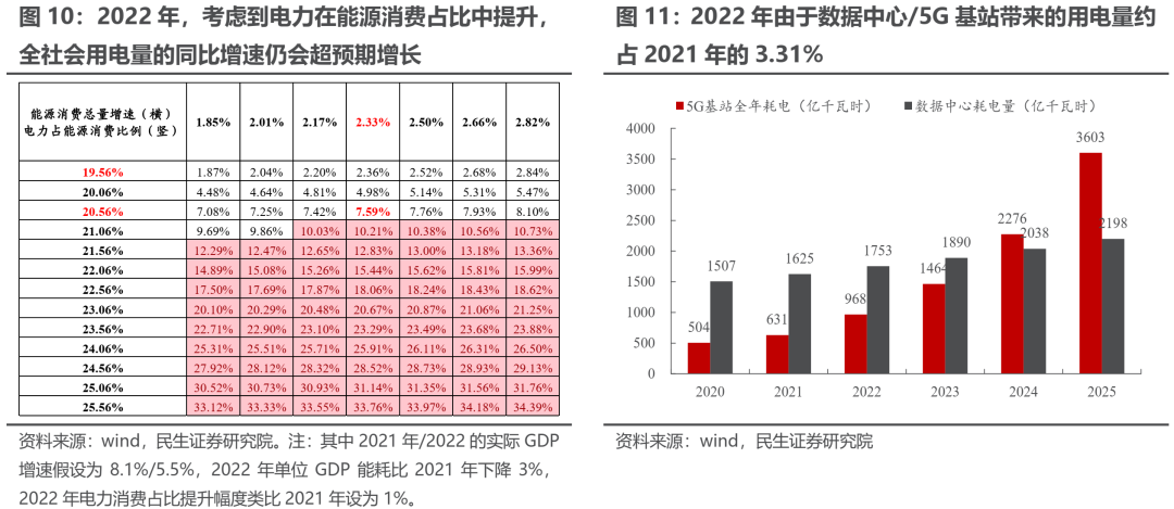 (1)随着新能源、数字经济甚至是元宇宙的发展,人类对于电力的依赖只会越来越强,这与人类从渔猎社会进入到农耕时期对于食盐的直接需求越来越强类似。我们此前曾在年度策略《终莫之胜》中对于2022年电力需求增速进行过测算,如果更新到最新数据,考虑到单位GDP能耗下降、实际GDP增速以及电力消费占比的因素,则2022年中性情形假设下全社会用电量的同比增速为7.59%。需要关注的是,由于数字经济的发展,数据中心/5G基站建设带来的用电量约占2021年的3.31%。电力正成为工业化、信息化甚至数字化社会中一种高频的必需品。