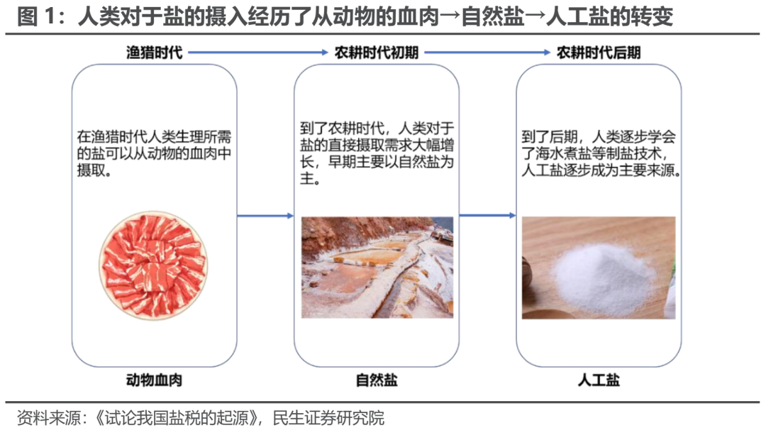 盐是生活中极为普通但却又不可或缺的商品之一,尤其是对于我们这么一个爱吃盐的国家而言。俗语道:“我吃过的盐比你吃过的饭还多”,据英国伦敦玛丽女王大学的研究表明,中国是世界上食盐人均摄入量最高的国家之一。正是因为盐对于生活的重要性,在历史上盐的生产成为了我国最早的经济产业之一,食盐专营收入也因此成为了我国古代国家重要的财政收入来源之一。时过境迁,盐税依旧存在,但已不是财政收入的核心,然而其发展历史却值得我们思考与借鉴:如果要在当前能源转型的背景下,去寻找类似当年的盐一样在生活中不可或缺但极为普通的商品,电力大概可以满足上述特征。随着电力系统在新能源、数字经济甚至是元宇宙的发展过程中越来越重要,我们也需要以一种不一样的视角去看待电力的发展。在古代,食盐对于人类发展的重要性不言而喻:六世纪的伊西多尔曾写道:“没有什么比盐和太阳更重要的了”;而在我国古代,“立国须有盐,无盐不立国”。第一,生产方式和食物结构的转变。在早期的渔猎经济,人类由于以肉食为主,主要的盐分可以从动物的血和肉中摄取,因此对于盐的直接需求很少;但到了后期转向农耕经济时,以素食为主,人类生理对于盐分的需求就开始转向直接从食盐中获取,此时对于盐的需求开始大幅增长。《说文解字》中对于“盐”的释义是:“盐,卤也。天生曰卤,人生曰盐。”即把自然盐称之为“卤”,而人工加工过的盐称之为“盐”。早期社会最早发现和最多利用的是自然盐,湖盐(又称池盐)即典型的自然盐,“池盐”具有天然结晶而无需加工的特点,是我国先民最早享用的自然盐 。然而随着生产力的不断增长,人口也随之不断增长,此时人类对于食盐的需求大幅增加,自然盐显然不能满足人类的需求,人工制盐开始浮出水面。即便如此,由于人工制盐的技术在较长时期内较为落后(主要依靠海水煮盐),加上运输成本较高,费时费力,因此古代的盐大多供不应求,价格昂贵,更不用说由于后来的盐税导致盐价进一步上涨,所以平常人家吃盐较少。第二,由于盐还有腌制食品以延长保质期的作用,因此在储存食品和货物运输、贸易等方面具备十分重要的用途。随着经济的不断发展,人类在这些方面对于盐的需求增长也不比人本身的生理需求少,这进一步加剧了盐的短缺。德国至今还有一条“古盐路”将盐都吕讷堡和波罗的海沿岸连接起来,这些盐曾在过去数百年间被转运到欧洲其他国家,他们用来腌制鲱鱼,并获得了丰厚的利润。根据《续资治通鉴长编》记载,北宋初年盐的官方售价大概在44-34文/斤不等,而当时1石米(约合120斤米)的售价约400文,因此1斤盐(按40文/斤算)≈12斤大米,如果按照现今的米价(国内1月28日的小包装大米零售价为3.35元/斤)进行折算,则古代的1斤盐价达到了现价约40元/斤。