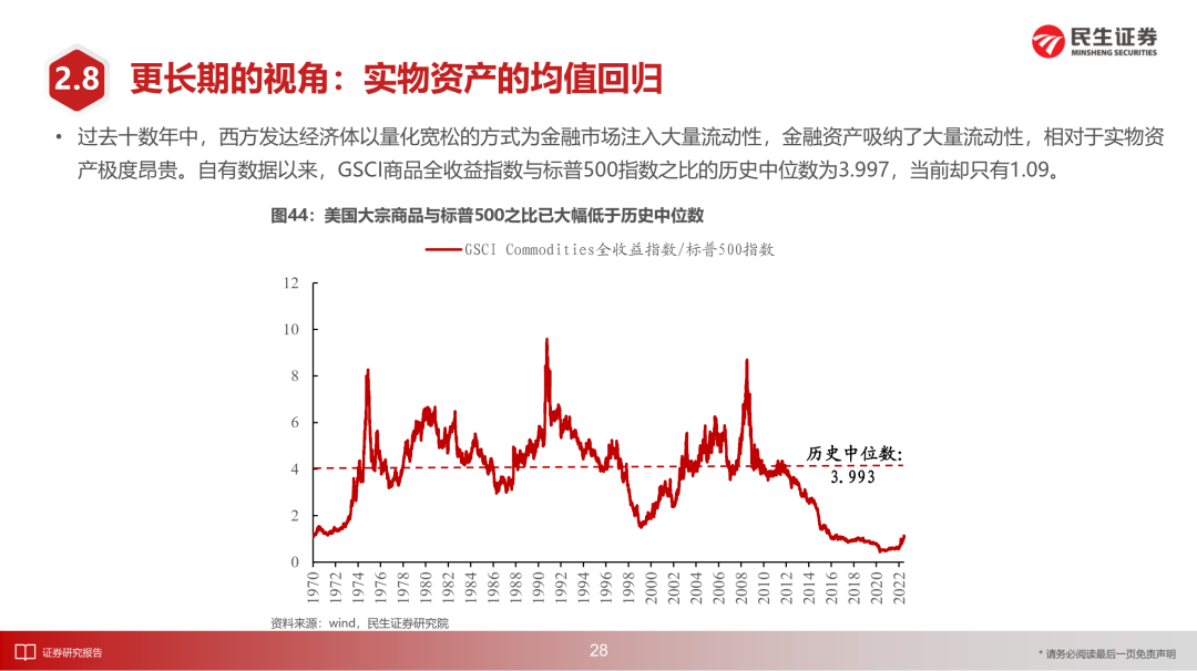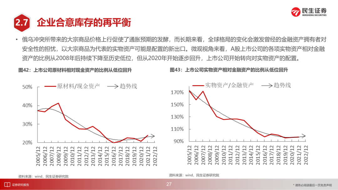 2022年以来,从利润占比与收益率回归ROE看,投资者对于不同的景气变化之间仍然非常“偏心”,赛道行业的利润增长与盈利变化明显获得了更多追捧。但需要注意的是:一方面是高景气赛道内部已经悄然分化,主要行业的盈利增速中枢已经开始下移;另一方面,却是全市场对于长期通胀的问题认知不足。通胀即使因为短期需求下滑为代价被抑制,但是长期经济需要增长,通胀则可能以更猛烈的形式回归。从这个意义看,商品价格在过去很好的表达了供需矛盾,然而股票市场反而对大宗商品生产商定价不足。当然,对于资源股而言有两层投资思路:一层是基于当期景气,带来占优的相对受益;一层是从中期视角看,大宗商品生产商应该在更长时间中完成产能价值的重估。具体来看,如果进入滞胀环境,能源(油、动力煤、气)将具有盈利优势, 解决资源空间错配的油运也将迎来重估。如果进入滞胀后期并转入衰退,黄金和工业金属将迎来反弹。当然中国需求是新的变量,如果中国需求V型反转,那么工业金属同样具有弹性。中国经济的需求是未来的重要变量,那么也可以布局风暴中心的低估值板块:建筑、房地产、银行。白酒会因为消费场景的恢复继续获得分子端预期的修复。成长领域需要寻找新的方向,更好独立于全球的制造业波动:军工、数字经济。主题上建议关注:高标准农田。