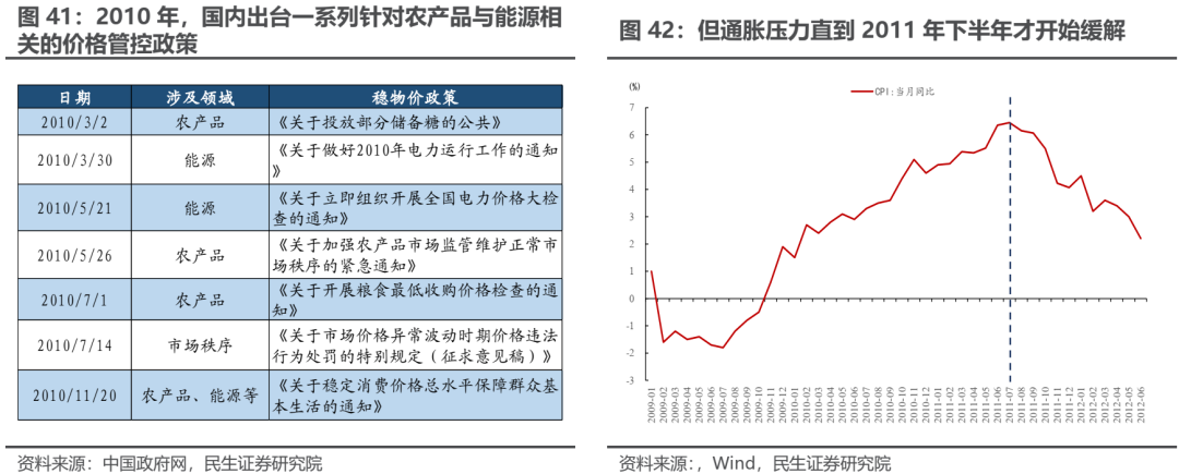 但值得注意的是,就抑制整体通胀来说,针对部分行业的价格管制可能不会取得立竿见影的效果。从国内的经验来看,以2010年为例:在通胀压力便逐步增大的背景下,发改委先后在农产品、能源等领域采取一系列措施以稳定经济运行,具体措施包括开展农产品市场专项价格检查、加大政策性储备粮油肉投放、协调煤电油运等 [11],并于2010年11月20日发布《关于稳定消费价格总水平保障群众基本生活的通知》;但是CPI同比增速直到2011年8月才从高点回落。因此,如果通胀压力持续上升,那么国内价格管控的范围有可能会扩大。在对部分价格进行管制过程中,可能会反而激发其他供需矛盾并不十分突出的领域进入价格上涨趋势,带来新的投资机遇。