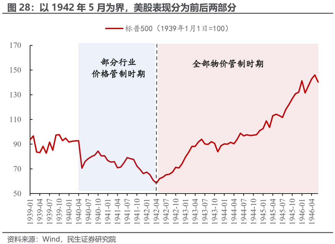 二战时期美国在1940年5月至1946年6月期间实行大规模的价格管制,其中1940年5月至1942年4月为部分行业价格管制时期,1942年5月至1946年6月为全面价格管制时期。这次大规模价格管制时期,美股整体走势恰好也以1942年5月为界分为前后两部分:1942年4月及以前部分价格管制时期美股接连下挫,1942年5月至1946年6月间全面价格管制时期美股持续上涨。其背后可能是价格管制与其他因素的共同作用(例如战局走势)。