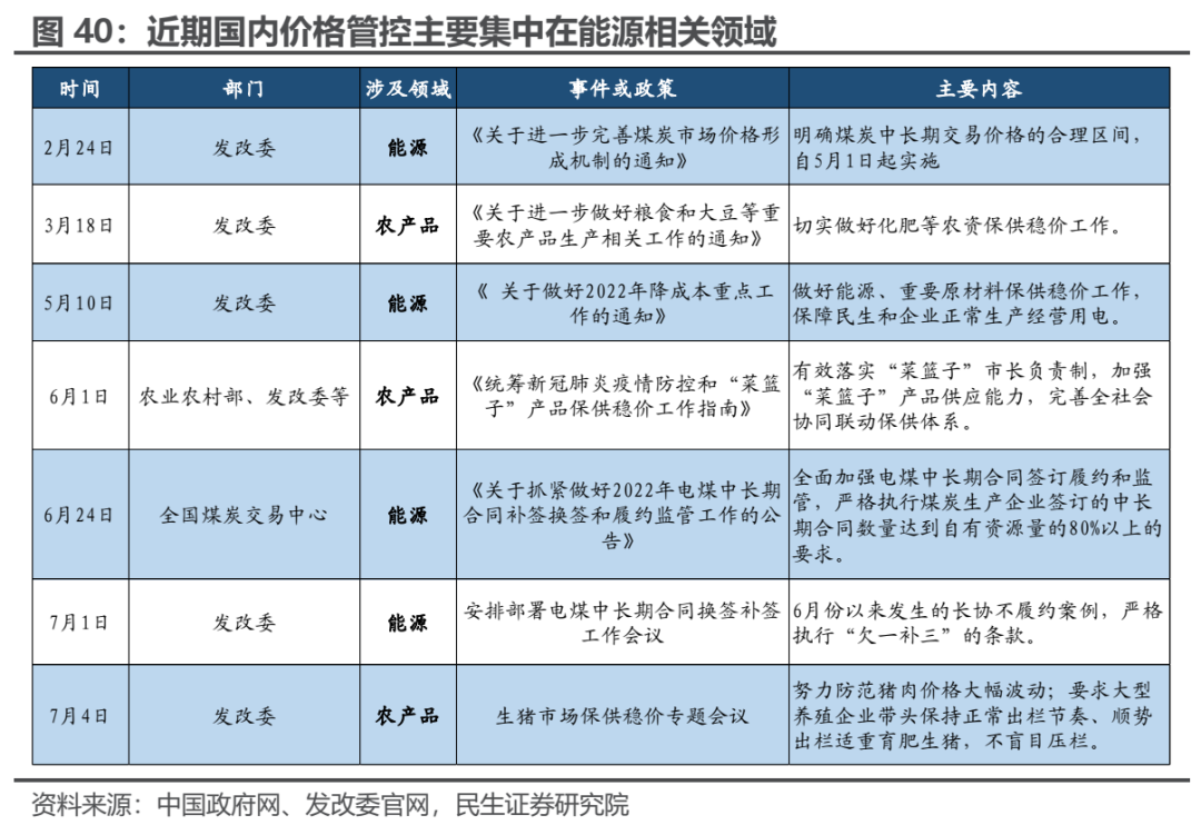 当前,国内保供稳价相关政策的主要焦点在能源和农产品领域。最近半年以来,一系列涉保供稳价政策落地。而在近期能源价格维持高位、部分农产品价格快速上升的背景下,发改委先后为先后在7月1日和7月4日召开“安排部署电煤中长期合同换签补签工作会议”和“生猪市场保供稳价专题会议”,有效稳定住市场对相关商品的价格预期。