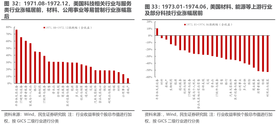 美国在二战后期(1942.05-1946.06)和70年代前期(1971.08-1974.04)实施全面价格管制的政策。这两段时期价格管制的主要思路是控制企业利润率(或利润额)不可提升。从管制结果来看,1942年5月后美国通胀压力持续下行,并在管制结束前始终处于低位;70年代的管制起初也有较好效果,但是自1973年1月至1974年6月以物价却快速攀升。1973-74年的全面价格管制并没有像二战后期那样取得成功,其原因在于1973年以来美国遇到了明显的输入性通胀压力,且没有战争时期的社会共识:1973年初农产品价格开始快速上涨,而当年10月份则出现了第一次石油危机。从股票市场的表现来看,二战后期,服务业、纺织服装、商贸零售等行业集中度低、监管成本较大的行业涨幅居前,而金属制品、机械设备、化工制品等中上游制造业涨幅排名靠后;1971年8月至72年底,美股同样是监管成本较高的服务类行业以及科技相关行业(产品更新快)涨幅居前。在1973-74年价格管制效果不佳时期,上游能源、材料行业相对抗跌,科技领域出现分化,而服务业相关行业则跌幅居前。值得一提的是,对上游部门的超额利润税并未阻止相关公司股票价格的上涨。另一方面,价格管制也会损害量的增长,在二战时期实行物资配给制度期间,美国居民人均食糖的消费量相较于1936-1939年下降了16%,咖啡的消费量下降8.5%,罐装水果、鱼类的消费量分别下降了24%和27%。