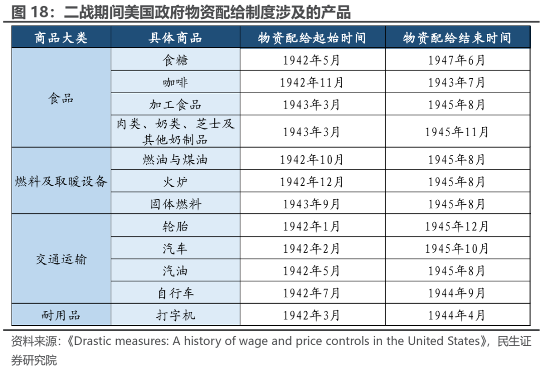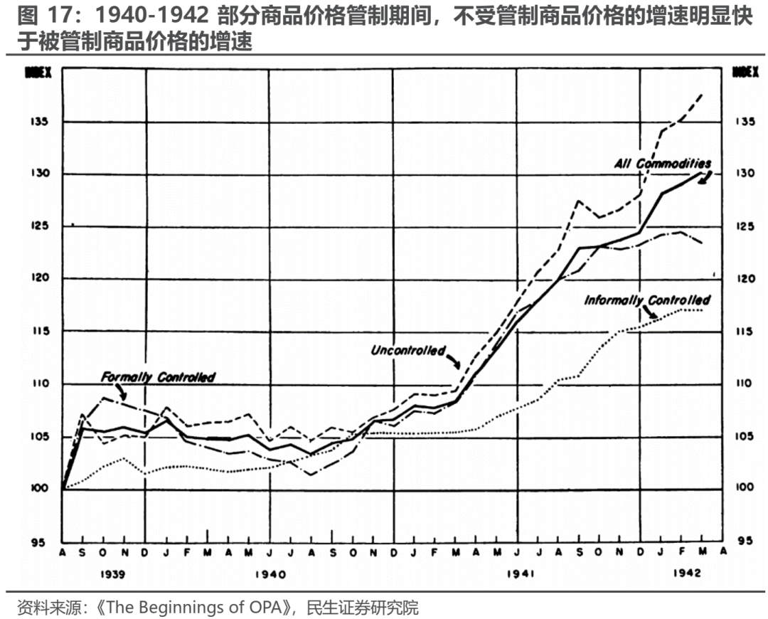 部分行业价格管制时期,整体通胀不能得到很好抑制的核心原因在于部分价格管制所带来的溢出效应:对重点行业的价格管制并没有限制居民的购买力,而不受价格管制影响的行业则成为吸收居民过剩购买力的主要渠道。具体到市场表现来看,一战时期几乎不受价格管制的纺织品、以及二战前期受价格管制影响最小的农产品恰恰是物价上涨最快的行业。