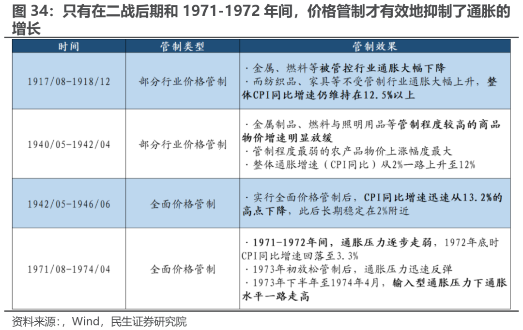 从历史经验来看,全面价格管制在实施之初往往可以非常有效地抑制通胀。1942年4月底《价格上限全面管控条例》颁布通过之后,美国CPI同比增速便见顶回落;1971年8月开始进行物价冻结后,通胀增速也持续下行。类似的现象甚至在民国末期也有出现:1948年8月南京国民政府孤注一掷推行金圆券改革时同时进行价格管制,国统区内上海等大城市在8月至10月间一度出现短暂的物价稳定。(参见报告《通胀往事:法币崩溃与物资本位》)