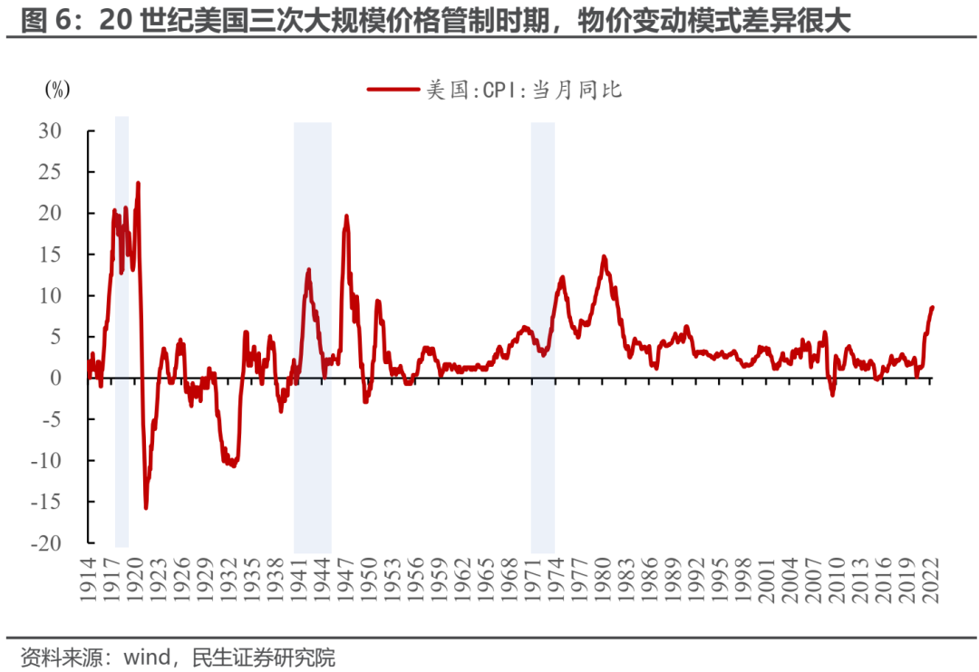 然而,全面价格管制并不是彻底根除高通胀的灵丹妙药。历史经验表明,价格管制只是延缓了通胀到来的时间。待到全面价格管制放松或取消之时,货币流通速度将会加快并逐步恢复到正常时期的水平,同时物价往往会有快速的上涨。1946年6月全面价格管制结束以后,美国CPI同比增速迅速从6月份的3.3%飞速上升至12月底的18.1%;类似的,美国政府在1973年初认为价格管制措施已很好的控制通胀,并大幅放宽管制措施后,通胀压力也出现了明显的上升。也就是说,以全面价格管制来控制通胀只是以未来的“长痛”来代替眼下的“短痛”。