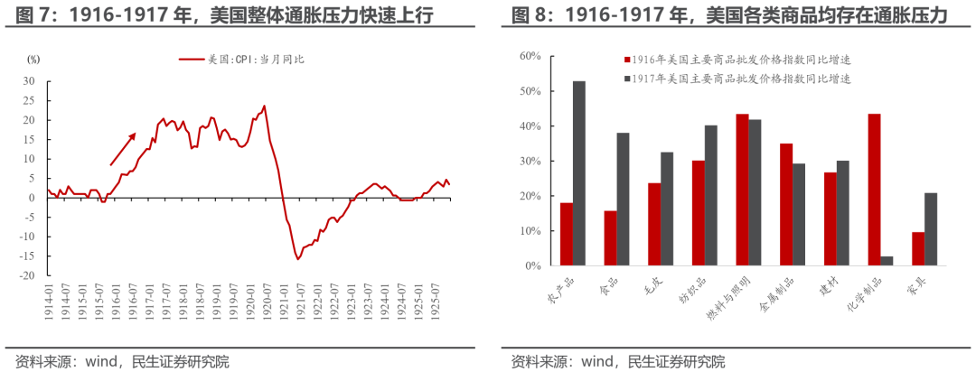 价格管制的相关措施从1917年8月起持续到一战结束,在1918年12月底,大多数管制措施基本都已结束。在此期间,对于商品最高售价受到严格限制的行业来说,其物价增长速度明显放缓:1918年,照明燃料类商品批发物价的同比增速为3.6%,毛皮类商品批发物价的同比增速为1.5%,金属类商品的批发物价指数更是下降了9.4%。然而,这一时期美国整体的通胀水平仍然很高,自1917年初到1919年底,美国CPI月同比增速均在12%以上。