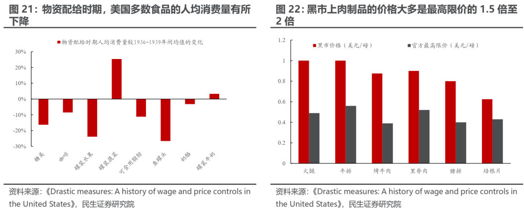 代价之二则是居民生活水平不可避免地会受到影响,最终量的增长也会放缓。在实行物资配给制度期间,美国居民人均食糖的消费量相较于1936-1939年的平均水平下降了16%,咖啡的消费量下降8.5%,罐装水果、罐装鱼类的消费量则分别下降了24%和27%。与此同时,价格管制也导致黑市的出现。根据当时的统计,黑市上肉制品的价格大约是管控价格上限的1.5倍至2倍左右。