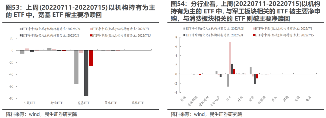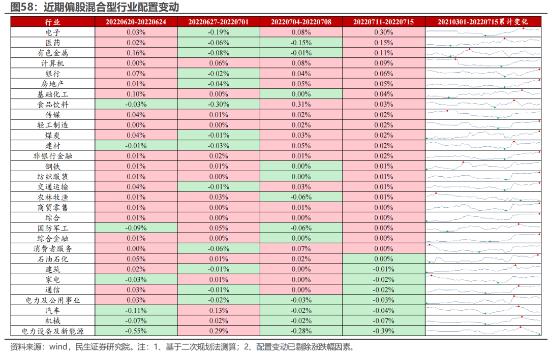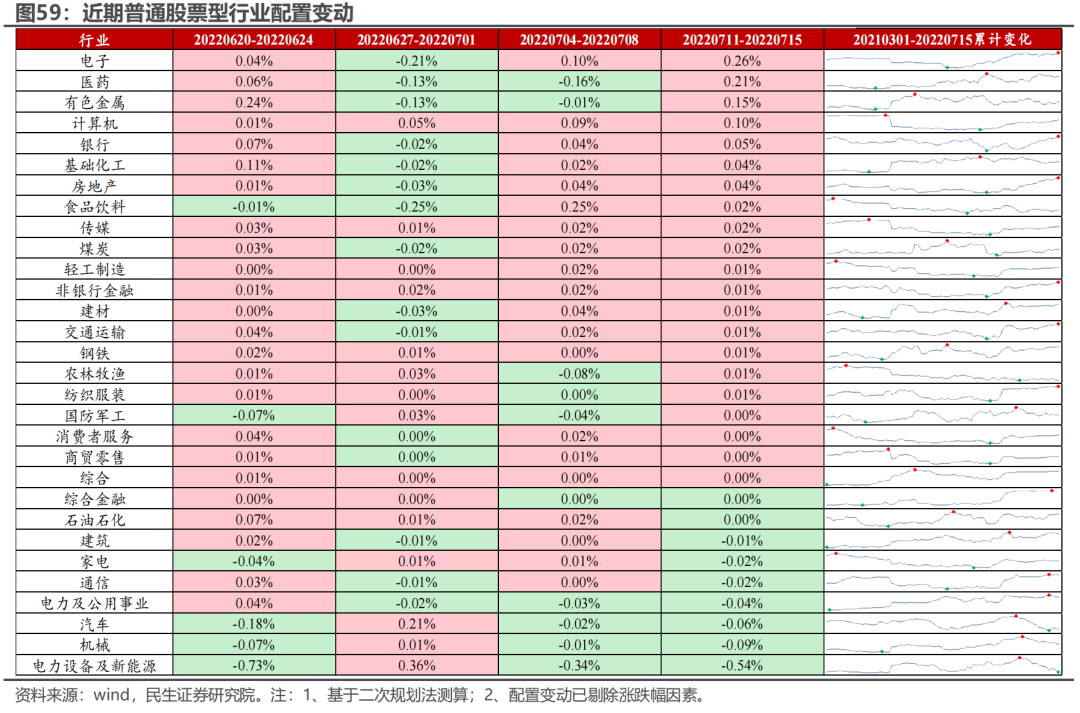 基于二次规划法测算:在剔除涨跌幅因素后,上周(20220711-20220715)主动偏股基金主要加仓电子、医药、有色、计算机、银行、房地产、化工、食品饮料等板块,主要减仓电新、机械、汽车、电力及公用事业、通信、家电等板块。风格上,主动偏股基金的净值收益与中盘成长板块的相关性上升,与大盘/小盘成长、大盘/中盘/小盘价值的相关性下降。新发基金方面,上周新成立的主动/被动偏股基金规模环比下降/上升,平均发行天数均有所缩短。上周以个人持有为主的ETF先被申购后被持续赎回,其中,与科技、金融地产、军工、周期、医药等板块相关的ETF被主要净申购,与新能源、建筑建材、消费板块相关的则被净赎回。公募与其负债端(个人)的共识在于同时买入金融地产、军工、医药等板块,并卖出新能源板块,而在科技、周期、建筑建材、消费等板块存在分歧。综合来看,上周市场整体共识度有所下降,趋势交易者(北上交易盘、两融)在逐步“撤出”,而偏稳定的北上配置盘有所“反复”,交易结构的“脆弱性”仍在显现。值得关注的是,当前外资正在“感知”银行-地产链的风险并逐步卖出相关板块,此外,北上也正在从过去表现占优的成长板块中逐步“撤离”。
