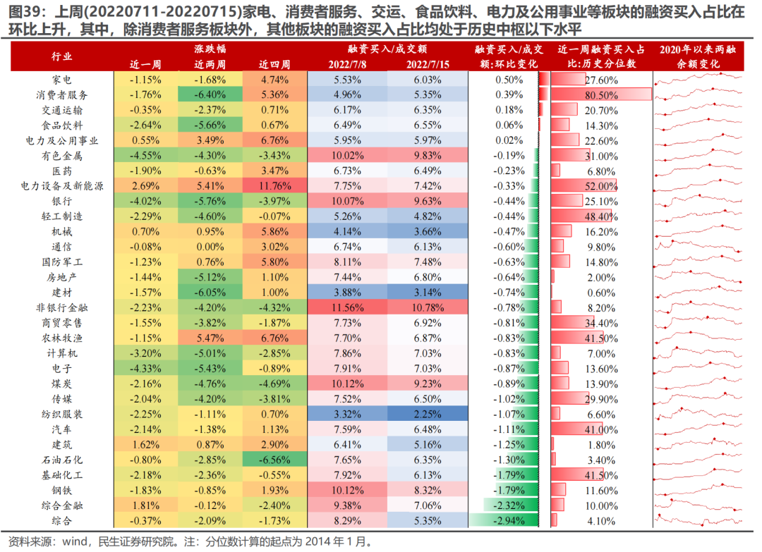 6.2 家电、消费者服务、交运、食品饮料、电力及公用事业等板块的融资买入占比在环比上升,其中,除消费者服务板块外,其他板块的融资买入占比均处于历史中枢以下水平