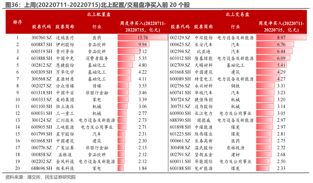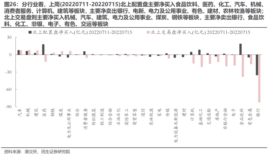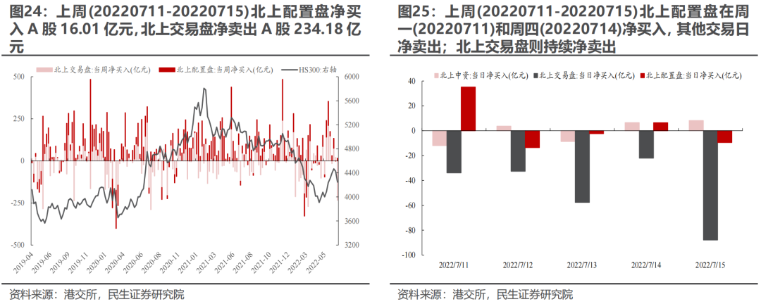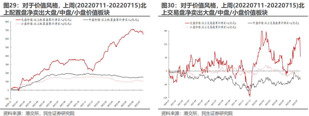 上周(20220711-20220715) 北上配置盘净买入16.01亿元,交易盘净卖出234.18亿元。日度上,北上配置盘在周一、周四净买入,其他交易日净卖出;北上交易盘则持续净卖出。行业上,两者共识在于净买入汽车、机械、建筑、钢铁等板块,同时净卖出银行、有色、电子、房地产、建材等行业。风格上,配置盘与交易盘同时净卖出大盘/中盘/小盘价值板块,而在成长板块存在分歧。对于配置盘前三大重仓股,配置盘净买入贵州茅台、美的集团7.12亿元、3.39亿元,净卖出宁德时代8.02亿元。分市值看,配置盘在电新、家电、钢铁、电子等板块主要挖掘500亿元市值以下标的。