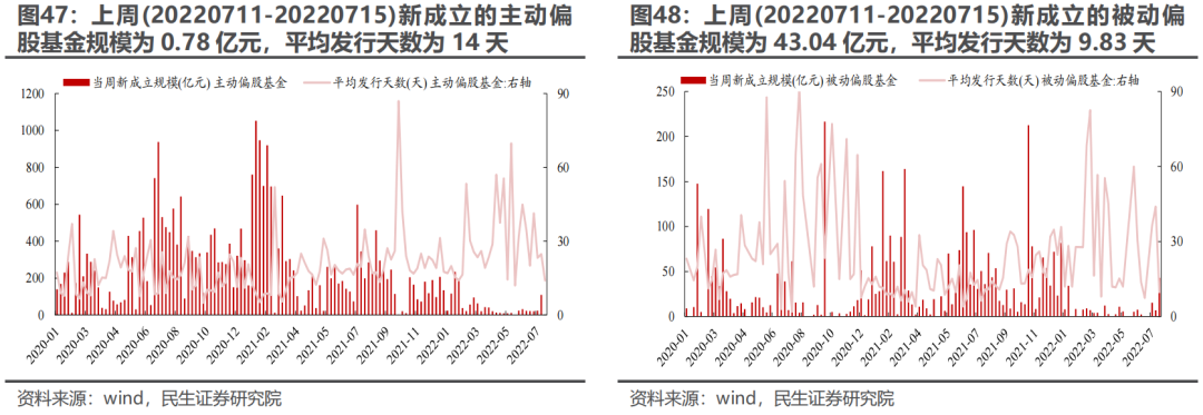 7.3 新成立的主动偏股基金规模环比下降、新成立的被动偏股基金规模环比上升,平均发行天数均有所缩短