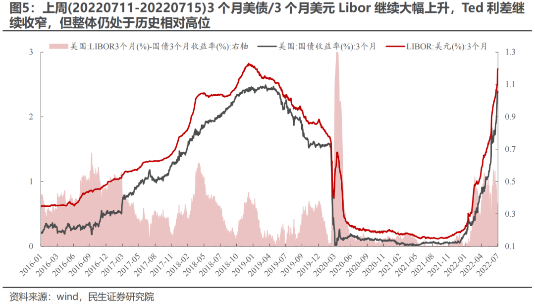 上周(20220711-20220715)美元指数继续上行,中美利差“倒挂”程度有所收敛,10Y美债名义/实际利率均回落,通胀预期略回落。对于海外,Ted利差继续收窄,但仍处于相对高位,离岸美元流动性可能仍偏紧;对于国内,银行间资金面整体宽松,流动性分层不明显,期限利差(10Y-1Y)重新走阔。