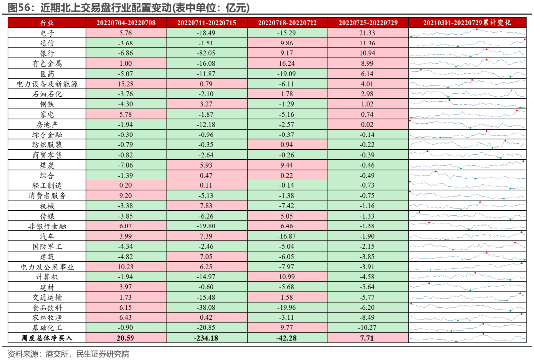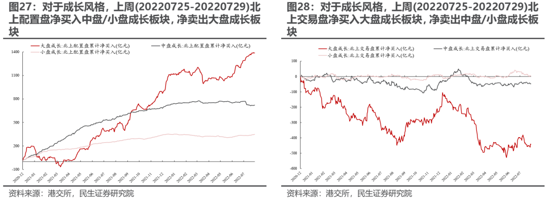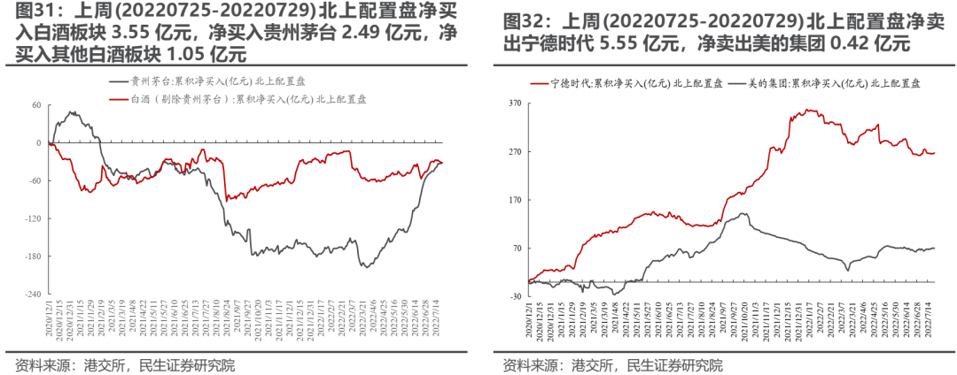 上周(20220725-20220729)北上配置盘净卖出0.78亿元,交易盘净买入7.71亿元。日度上,北上配置盘/交易盘均频繁“反复”。行业上,两者共识在于净买入电子、通信、医药、有色、石油石化等板块,同时净卖出建材、交运、农林牧渔、建筑、非银、消费者服务等行业。风格上,北上配置盘与交易盘同时净买入中盘价值板块,而在其他板块(大盘/中盘/小盘成长,大盘/小盘价值)存在分歧。对于配置盘前三大重仓股,配置盘净买入贵州茅台2.49亿元,分别净卖出宁德时代、美的集团5.55亿元、0.42亿元。分市值看,配置盘在电子、交运、钢铁等板块主要挖掘500亿元市值以下标的。