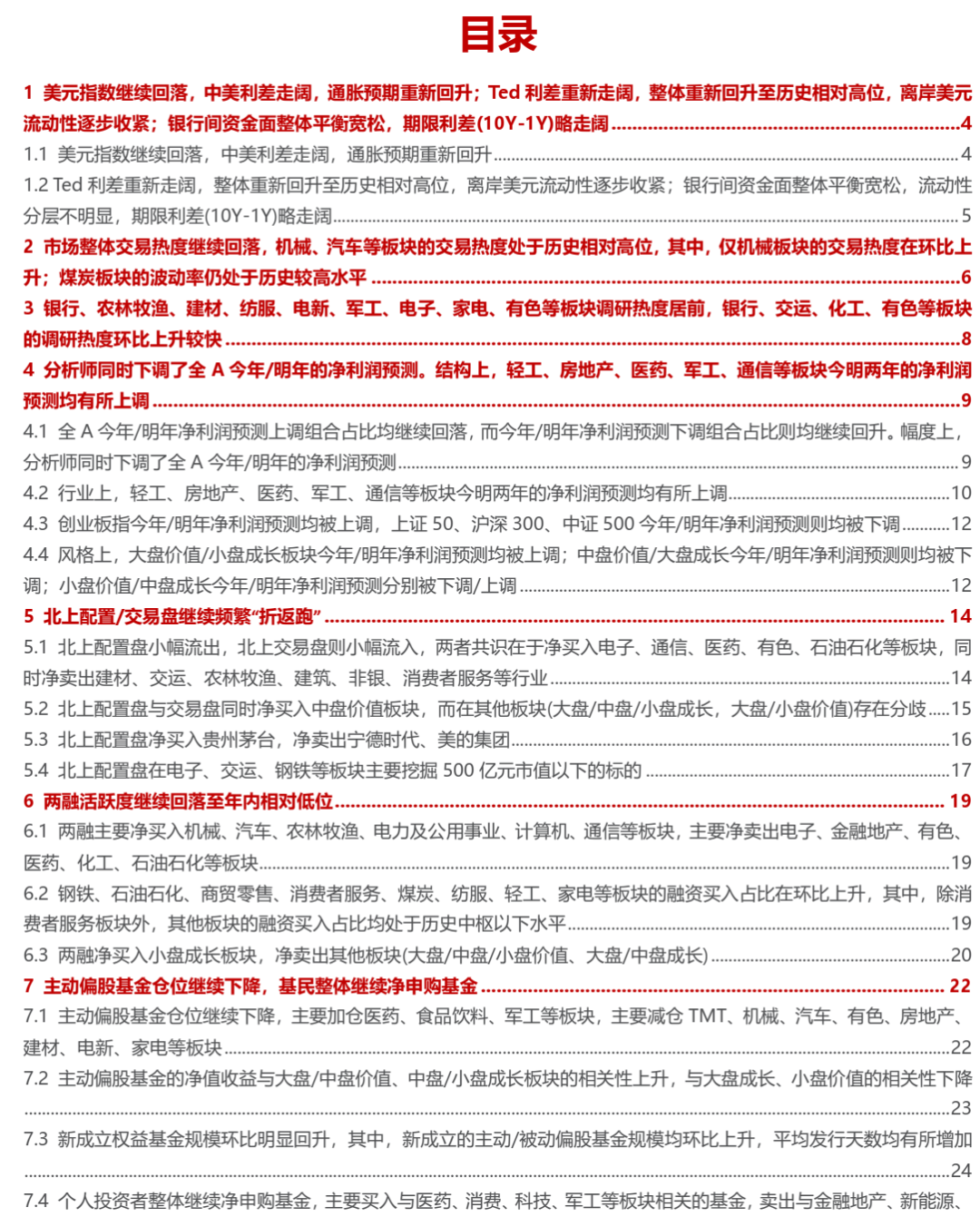 【本期看点】1、市场交易热度继续回落,机械、汽车板块的交易热度处于历史高位。2、分析师同时下调了全A今年/明年的净利润预测。行业上,轻工、房地产、医药、军工、通信等板块今明两年净利润预测均被上调。3、两融活跃度继续回落至年内相对低位,主动偏股基金仓位继续下降,以个人持有为主的ETF为代理变量显示:基民整体继续净申购基金。4、市场整体分歧仍较大,在钢铁、医药、军工、通信、食品饮料等板块相对较高。5、值得关注的是,偏稳定的北上配置型资金仍在继续从过去表现占优的成长板块“撤离”,并开始重新买入资源(煤炭、石油石化、有色)板块,而北上交易型资金和内资(公募、两融)对于前期强势赛道的交易行为则有所“反复”。
