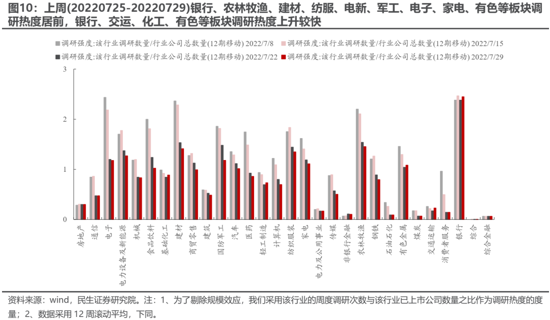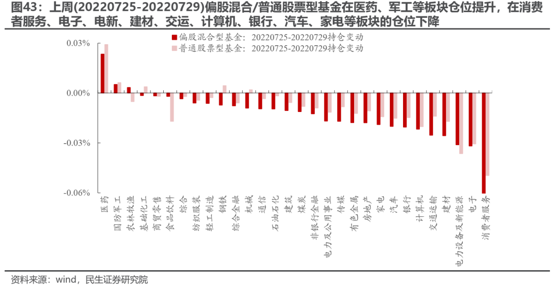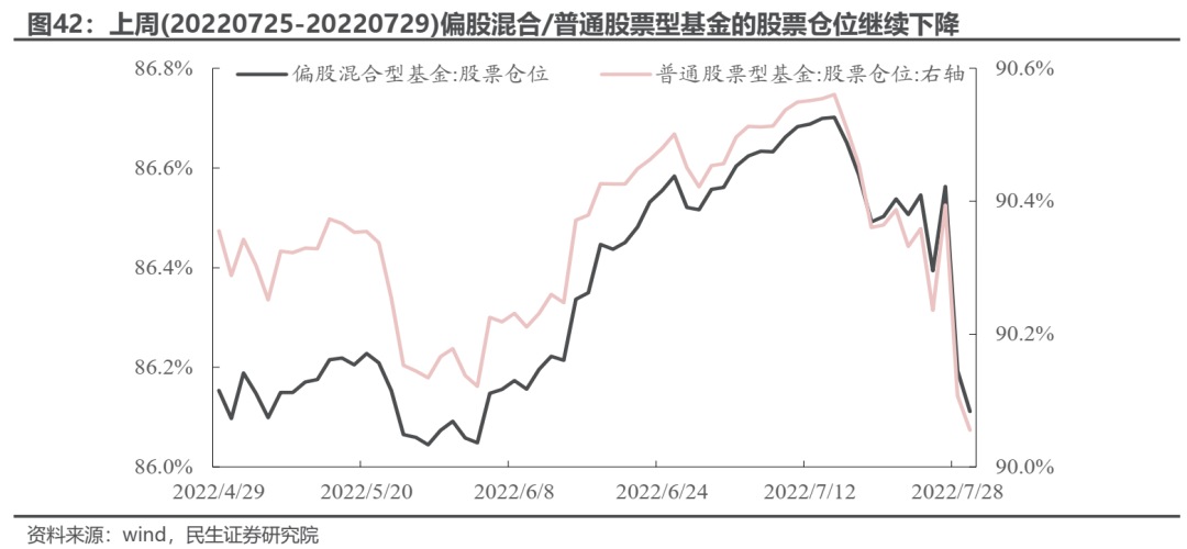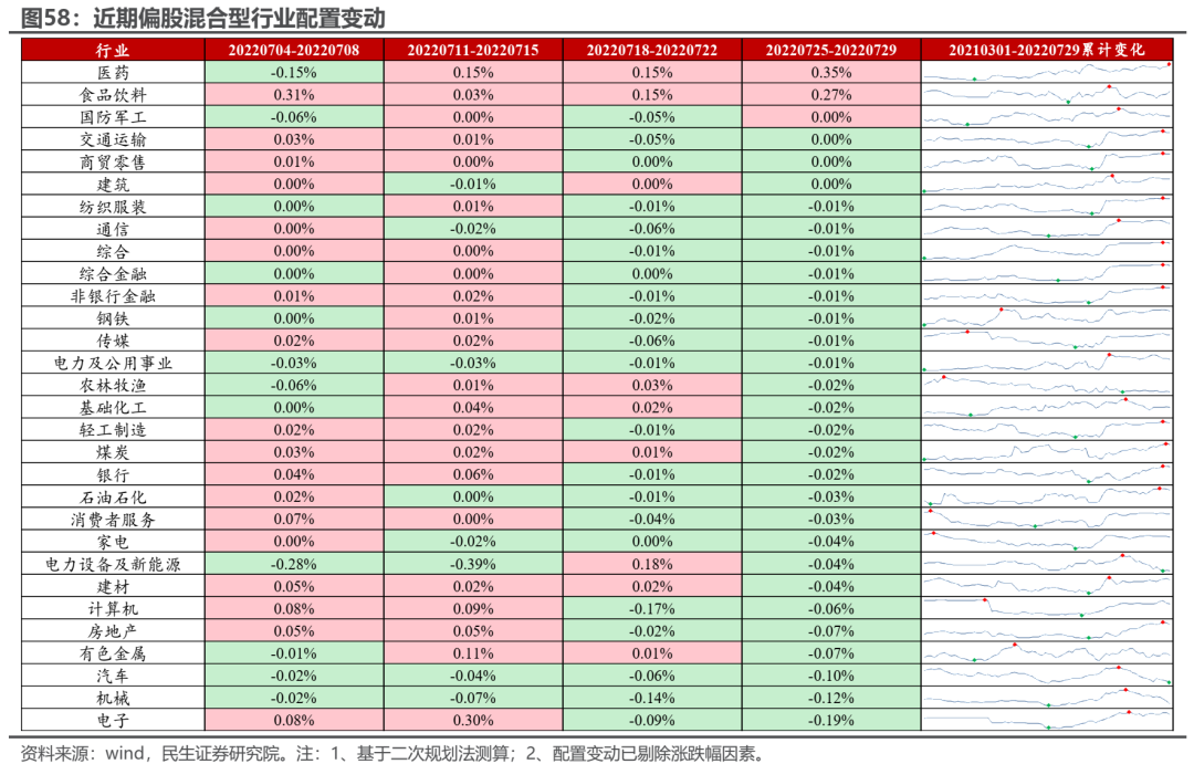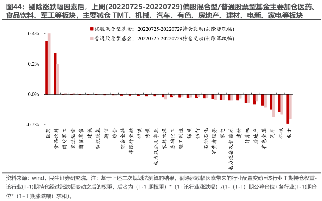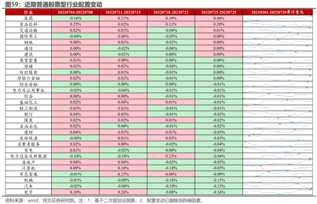 基于二次规划法测算:在剔除涨跌幅因素后,上周(20220725-20220729)主要加仓医药、食品饮料、军工等板块,主要减仓TMT、机械、汽车、有色、房地产、建材、电新、家电等板块。风格上,主动偏股基金的净值收益与大盘成长、小盘价值板块的相关性下降,与其他板块的相关性上升。新发基金方面,上周新成立权益基金规模环比明显回升,其中,新成立的主动/被动偏股基金规模均环比上升,平均发行天数均有所增加。上周以个人持有为主的ETF整体被净申购,其中,与医药、消费、科技、军工等板块相关的ETF被主要净申购,与金融地产、新能源、周期、建筑建材板块相关的则被净赎回。公募与其负债端(个人)的共识在于同时买入医药、消费、军工等板块,同时净卖出金融地产、新能源、周期、建筑建材板块,而在科技板块存在分歧。综合来看,市场整体分歧仍较大,在钢铁、医药、军工、通信、食品饮料等板块相对较高。值得关注的是,偏稳定的北上配置型资金仍在继续从过去表现占优的成长板块“撤离”,并开始重新买入资源(煤炭、石油石化、有色)板块,而北上交易型资金和内资(公募、两融)对于前期强势赛道的交易行为则有所“反复”。