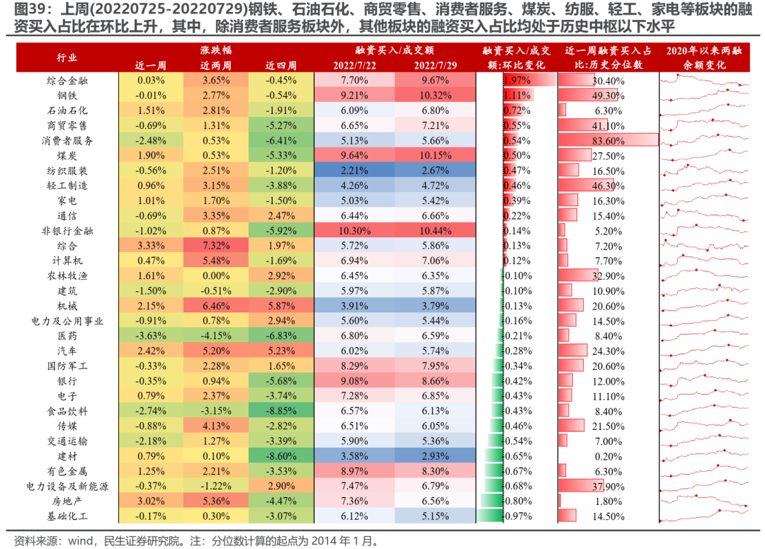 6.2 钢铁、石油石化、商贸零售、消费者服务、煤炭、纺服、轻工、家电等板块的融资买入占比在环比上升,其中,除消费者服务板块外,其他板块的融资买入占比均处于历史中枢以下水平
