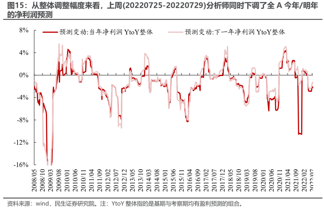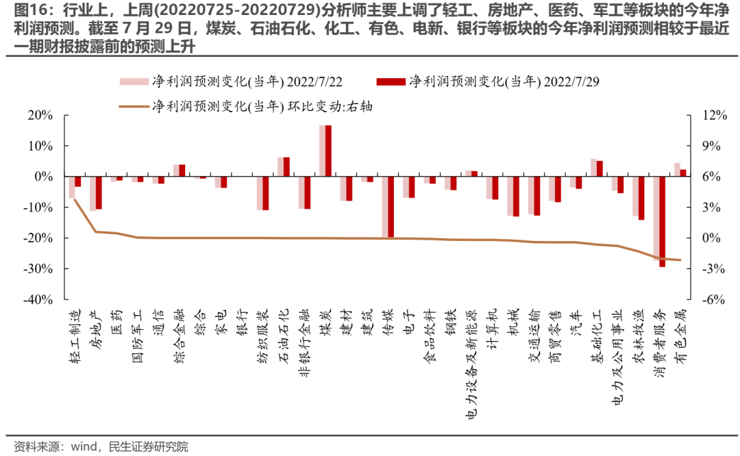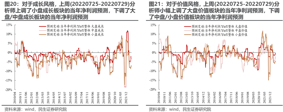 分析师同时下调了全A今年/明年的净利润预测。行业上,轻工、房地产、医药、军工、通信等板块今明两年净利润预测均被上调。指数上,创业板指今年/明年净利润预测均被上调,上证50、沪深300、中证500则均被下调。风格上,大盘价值/小盘成长板块今/明年净利润预测均被上调。