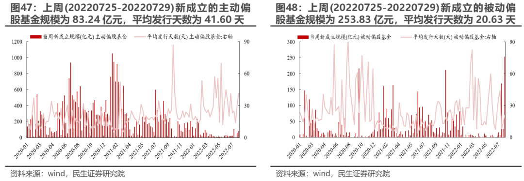 7.3 新成立权益基金规模环比明显回升,其中,新成立的主动/被动偏股基金规模均环比上升,平均发行天数均有所增加