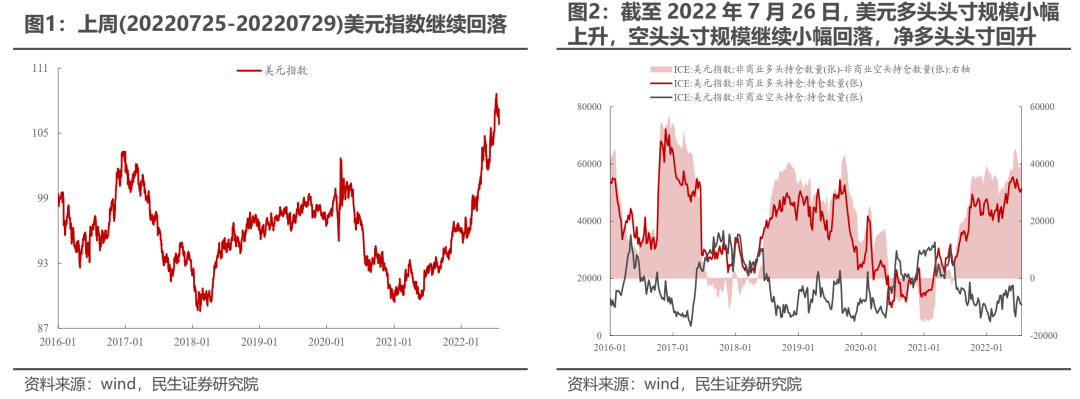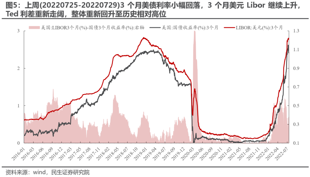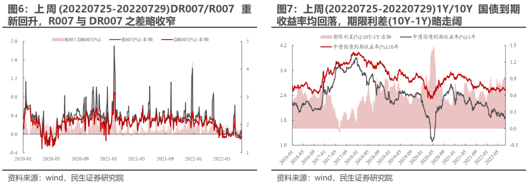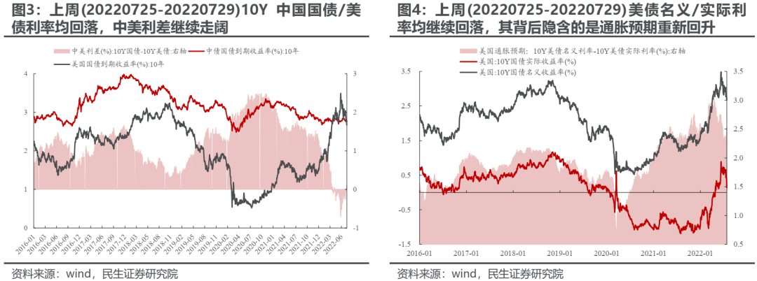 上周(20220725-20220729)美元指数继续回落,中美利差继续走阔,10Y美债名义/实际利率继续回落,通胀预期重新回升。对于海外,Ted利差重新走阔,整体回升至历史相对高位,离岸美元流动性逐步收紧;对于国内,银行间资金面整体平衡宽松,流动性分层不明显,期限利差(10Y-1Y)略走阔。