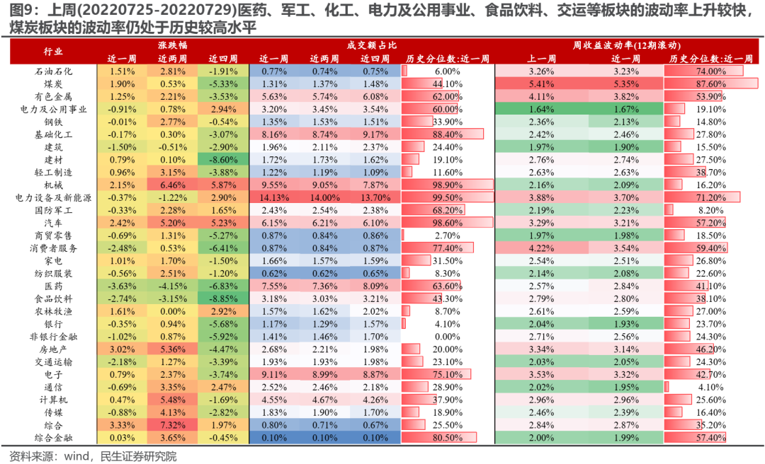 市场交易热度继续回落,机械、汽车板块的交易热度处于历史高位,其中,仅机械板块的交易热度在上升;波动率上,煤炭板块仍处于历史高位,医药、军工、化工、电力及公用事业、食品饮料、交运等板块上升较快。