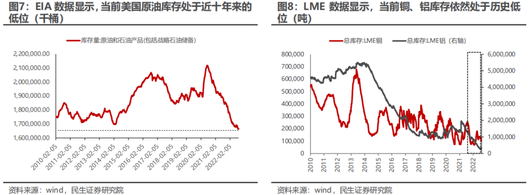 本周最后两个交易日美股进行衰退交易,美元指数同样边际走弱,相较而言,大宗商品市场表现却展现出较强的韧性,原油价格反而出现反弹。这背后体现的正是我们前期报告中所强调的:大宗商品前期的下跌已经充分计入了投资者对全球经济(尤其是美国)衰退的预期,体现在2022年Q2大宗商品价格下跌时,也伴随着铜、铝、原油的期货非商业多头头寸的持续下降,然而事实上,其基本面上供给端的矛盾并未向以往需求下行周期中一样被解决,大宗商品库存始终处于历史低位。当真正衰退来临之际,市场将对本轮大宗商品真实的供需格局有更加清晰的认知,在高金融资产与安全诉求下,增长≠需求≠通胀,因前期过多的“抢跑”行为导致被低估的大宗商品价格也将迎来广泛修正,而美元最终走弱将推升美元计价大宗商品的价值。衰退到来时,真正的“滞胀”或许才刚刚开始,这并非是美林时钟的“滞胀期”概念。