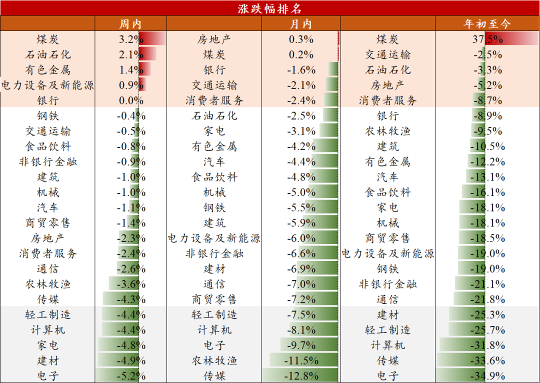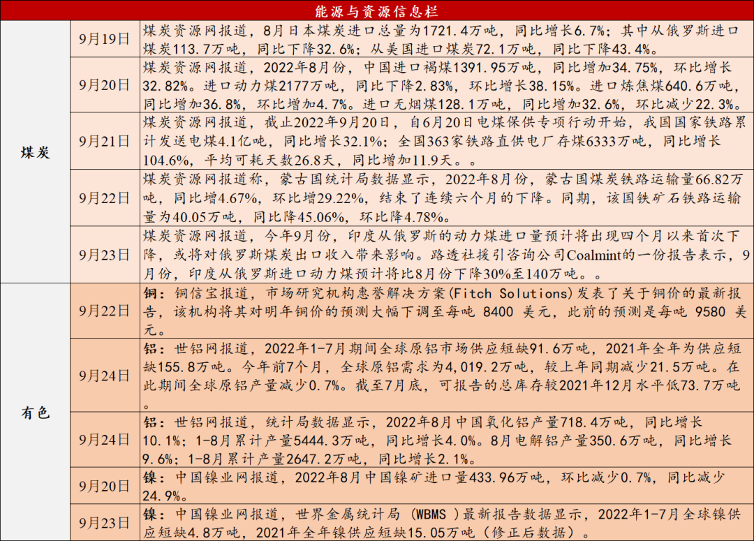 能源与资源板块:1)动力煤:根据CCTD数据,9月22日二十五省电厂日耗512.0万吨/天,环周-29.5万吨/天,可用天数20.7天,环周+1.3天。民生能源开采团队认为供给端,近期煤矿安全事故频发,停产减产和安全检查将导致上游生产收紧。需求端,受降温天气影响,东北局部地区正式供暖,河北、内蒙古的部分地区迎来大风降雪天气,带动煤炭采购需求节奏加快。国内动力煤价格有望接轨澳洲动力煤价格,仍具备上涨空间。2)焦煤:9月23日,京唐港主焦煤价格2570元/吨,环周+20元/吨。山西低硫环周+40元/吨,山西高硫环周+72元/吨,柳林低硫环周+20元/吨,灵石肥煤环周+100元/吨,济宁气煤环周+50元/吨,长治喷吹煤环周+230元/吨。民生能源开采团队认为供给端受安检问题影响,焦煤供给有收紧预期。而需求端,临近国庆,下游补库采购需求增加,焦煤后续价格韧性较足。3)有色金属:上周美元指数大幅上行3.1%,金属价格继续承压。根据民生金属团队数据,截至9月23日,LME铜、LME铝、LME镍和COMEX黄金分别为7444.5美元/吨、2167美元/吨、23380美元/吨和1651.7美元/盎司,环周-4.7%、-5.1%、-4.5%和-2.0%。4)航运:上周BDI指数环周+18.0%,BDTI指数环周+2.7%;BCTI指数环周+0.0%。