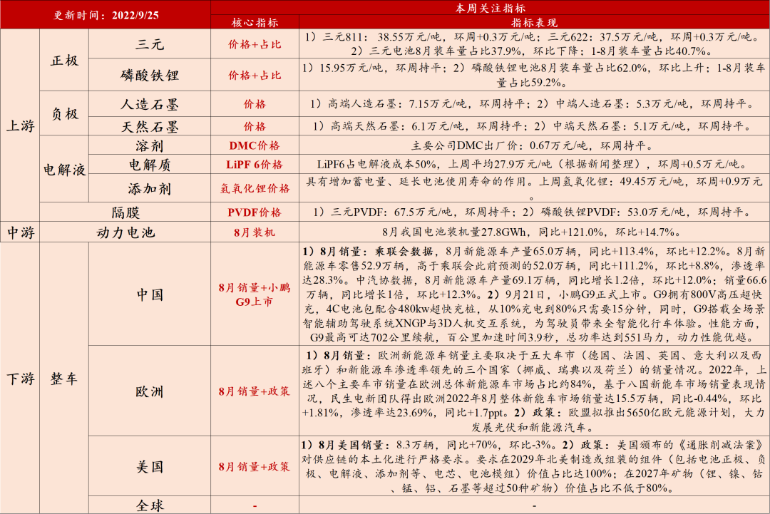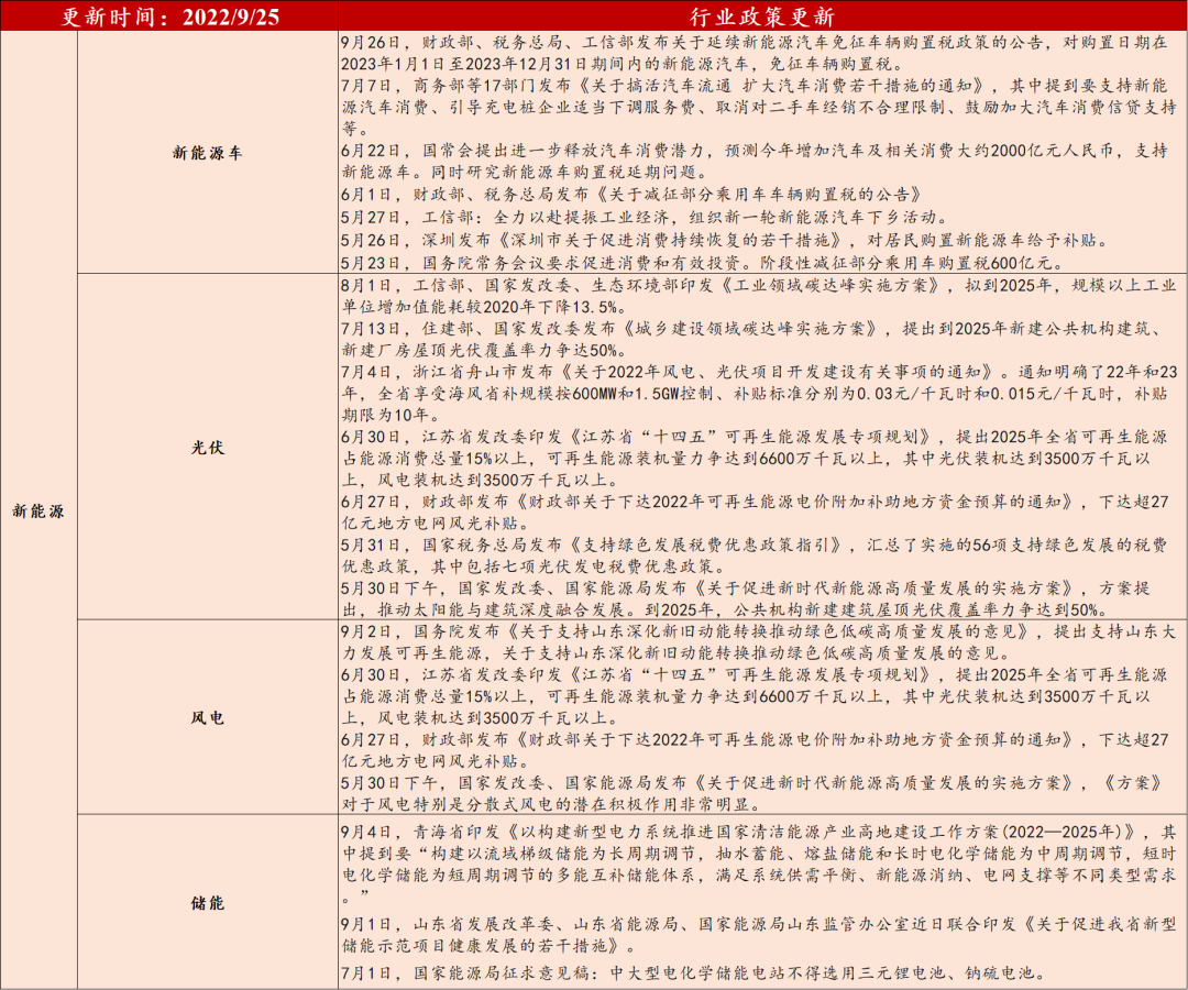 1)新能源车:a、政策:欧盟方面,9月23日,彭博社报道,欧盟将制定5650亿欧元的“能源系统数字化”计划,支持光伏和新能源车的发展,在2030年底以前实现3000万辆零排放汽车上路的目标。美国方面,《通胀削减法案》对供应链的本土化进行严格要求,要求在2029年北美制造或组装的组件(包括电池正极、负极、电解液、添加剂等、电芯、电池模组)价值占比达100%;在2027年矿物(锂、镍、钴、锰、铝、石墨等超过50种矿物)价值占比不低于80%。b、新车发布:根据民生电新团队整理,9月21日,小鹏G9正式上市。G9拥有800V高压超快充,4C电池包配合480kw超快充桩,从10%充电到80%只需要15分钟,同时,G9搭载全场景智能辅助驾驶系统XNGP与3D人机交互系统,为驾驶员带来全智能化行车体验。2)光伏:a、硅料:价格维持稳定。上周致密料价格维持在303-306元/kg。根据民生电新团队判断,由于目前硅料供应量仍偏紧,部分订单的价格仍然较高。b、新增装机:8月维持高增。1-8月全国光伏新增装机量达44.47GW,同比+101.6%,其中8月新增6.74GW,同比+64.0%。3)风电:8月当月新增装机同比负增长。1-8月全国风电新增风电装机16.14GW,同比+10.2%,其中8月新增1.21GW,同比-41.3%。4)储能:迎多项政策利好。9月1日,山东省发展改革委、山东省能源局、国家能源局山东监管办公室联合印发《关于促进我省新型储能示范项目健康发展的若干措施》。这是国内首个省级电力现货市场储能支持政策,推动新型储能的市场化发展。9月4日,青海省印发《以构建新型电力系统推进国家清洁能源产业高地建设工作方案(2022—2025年)》,对储能的建设规划更加清晰。