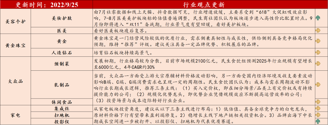注:1、红底部分的观点来自民生行业团队,黄底部分的观点来自民生策略团队。2、最右边栏箭头表示细分行业基本面较上周的表现,箭头向上代表行业基本面环比上周走强,箭头向下代表行业基本面环比上周走弱,箭头水平则代表行业基本面较上周持平。