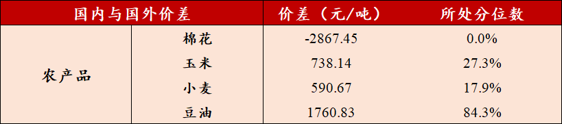 国内外价差:1)煤炭板块:动力煤(国内-海外)价差小幅缩窄,维持倒挂。上周动力煤价差为-861.41元/吨,处于2012年以来的3.1%分位数。焦煤(国内-海外)价差基本稳定,约561.93元/吨,处于2012年以来的85.9%分位数。2)金属板块:上周金属(国内-海外)价差大多上行。铜、铝价差分别为8478.92元/吨、2809.58元/吨,处于2012年以来的93.7%、82.0%。3)农产品板块:上周豆油(国内-海外)价差上行,玉米、小麦(国内-海外)价差下行。上周豆油价差1760.83元/吨,处于84.3%分位数(上上周64.8%);玉米价差738.14元/吨,处于27.3%分位数(上上周28.1%);小麦价差590.67元/吨,处于17.9%分位数(上上周23.4%)。(上周对应日期:9.19-9.23,上上周对应日期:9.12-9.16)。