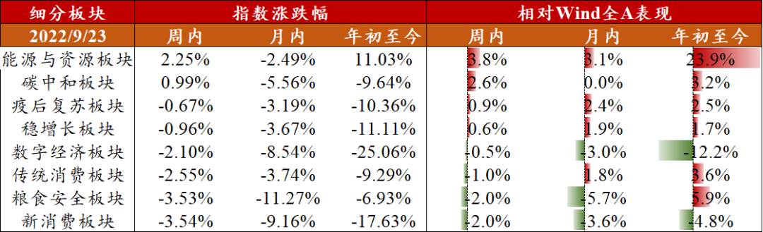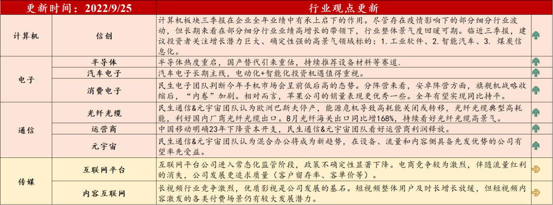 疫后复苏板块:1)疫情:国内疫情仍有波动,截至9月22日0-24时,31个省和新疆生产建设兵团报告新增确诊病例175例。2)白酒:茅台批价小幅下行,五粮液、国窖1573批价稳定。根据今日酒价披露的数据,上周飞天散瓶2750-2785元,整箱批价3060-3100元,批价小幅下行。普五批价约980 元,环周持平;国窖1573批价约920元,环周持平。3)国庆出行:热度环比提升。根据同程旅行数据,近一周“十一”相关旅游搜索热度环比上涨172%。酒店方面,根据携程程长营发布的《2022国庆大数据报告》,临近国庆,疫情防控态势严峻,国内整体酒店市场表现稍显冷清,预期热度恢复至2021年同期7成,上海、北京、杭州、长沙、南京位居酒店热门搜索目的地前列。4)航空方面:环比持续恢复。9月19日-9月25日,国内执行航班量日均6591.57架次,环周+19.5%。根据去哪儿平台数据,自中秋以来,十一国庆期间国内航班预订量环比增长显著,9月25日的机票预订量较两周前增长达10倍。