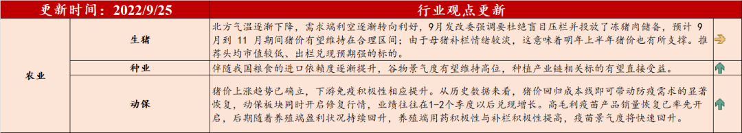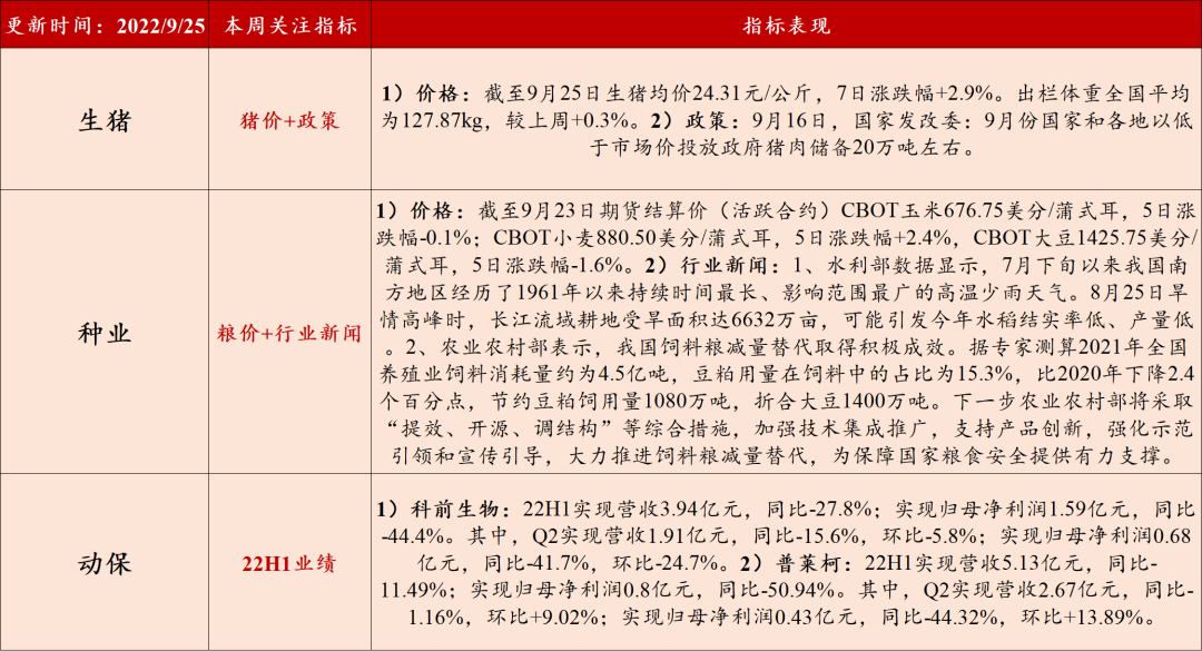 粮食安全板块:1)生猪:a、价格继续回升:截至9月25日生猪均价24.31元/公斤,7日涨跌幅+2.9%。近日国家发改委表示,猪肉价格进入过度上涨二级预警区间。b、政策:9月16日,国家发改委表示9月份国家和各地将以低于市场价投放政府猪肉储备20万吨左右。当前中央已连续3周投放猪肉储备(9月8日、9月18日和9月23日),约投放猪肉3.77万吨、1.5万吨和1.44万吨。本周国家将投放第4批中央猪肉储备。2)粮食:价格涨跌互现。截至9月23日期货结算价(活跃合约)CBOT玉米676.75美分/蒲式耳,5日涨跌幅-0.1%;CBOT小麦880.50美分/蒲式耳,5日涨跌幅+2.4%;CBOT大豆1425.75美分/蒲式耳,5日涨跌幅-1.6%。3)行业新闻:水利部数据显示,7月下旬以来我国南方地区经历了1961年以来持续时间最长、影响范围最广的高温少雨天气。8月25日旱情高峰时,长江流域耕地受旱面积达6632万亩,可能使得今年水稻结实率低、产量低。