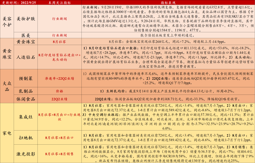 新消费板块:1)美妆护肤:李佳琦复播带动国货美妆品牌销量。根据民生商社团队整理,9月20日19时,停播109天的李佳琦低调复播,复播首场的观看量达6352.8万,点赞量超1.6亿。后续直播场次维持在3000万+的观看量。李佳琦的首场直播包括4大品类,美妆品牌以国货为主。根据《中国化妆品》统计,此次直播共上架商品26款,上架后当晚基本火速售罄,其商品栏共有19款SKU显示下架。预计此场直播GMV超过1.3亿元。9.20-24日间,华熙生物、贝泰妮旗下品牌均登录李佳琦直播间,其中夸迪玻尿酸清润次抛、薇诺娜光透皙白淡斑精华次抛、米蓓尔小蓝帽冻膜分别售出8万+、4万+、3万+,预估销售额分别超1584万、1196万、477万。2)培育钻石:8月进出口增速稳健,环比回落。8月印度培育钻石毛坯进口额1.13亿美元,同比+53.6%,环比-18.2%,增速较7月+28.2ppt,渗透率7.4%,同比+1.7ppt,环比+0.8ppt。8月印度培育钻石裸钻出口额为1.44亿美元,同比+14.7%,环比-2.4%,增速较7月-23.1ppt,渗透率7.1%,同比+1.3ppt,环比持平。