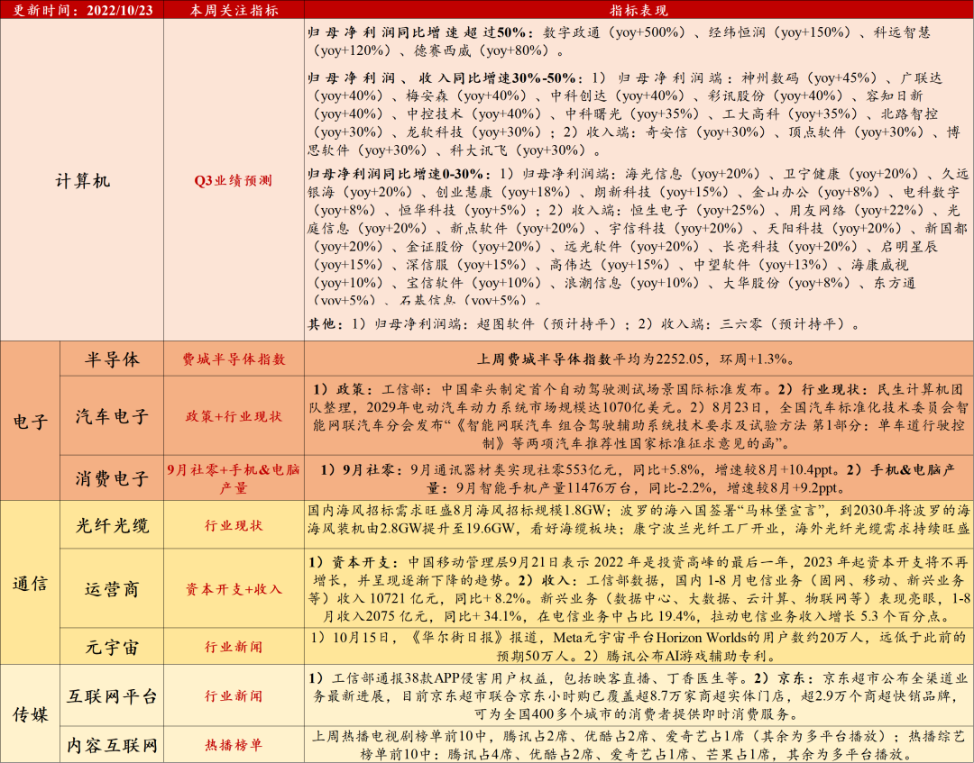 1)运营商:资本开支逐步下行,新兴业务表现亮眼。资本开支方面,中国移动管理层9月21日表示 2022 年是投资高峰的最后一年,2023 年起资本开支将不再增长,并呈现逐渐下降的趋势。业绩方面,根据工信部数据,国内1-8月电信业务(固网、移动、新兴业务等)收入 10721 亿元,同比+ 8.2%。新兴业务(数据中心、大数据、云计算、物联网等)表现亮眼,1-8月收入2075 亿元,同比+ 34.1%,在电信业务中占比 19.4%,拉动电信业务收入增长 5.3 个百分点。