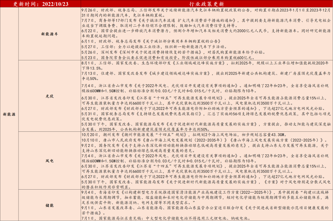 3)风电:潮州、唐山、汕头发布海风建设规划。a潮州:10月20日,潮州发布《潮州市能源发展“十四五”规划》,拟规划2个海上风电场址,初步规划总容量43.3GW。b、唐山:10月10日,唐山市人民政府发布《唐山市海上风电发展规划(2022-2035年)》《唐山市海上风电发展实施方案(2022-2025年)》,提出:1)到2025年累计新开工建设海风项目2-3个、装机3GW,累计总投资50亿元以上;2)到2035年累计新开工建设项目7-9个、装机13GW以上。c、汕头:9月26日汕头日报发文,汕头有望将装机容量扩大至60GW,并依托广澳港打造集施工建设、运维和出口为一体的海上风电母港,建设国际风电创新港。此前广东省发布的2017年至2030年的海上风电发展规划指出,汕头海风装机规划将超过35GW,占粤东区域规划的60%以上。