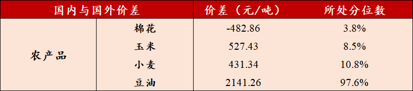 上周1)煤炭板块:动力煤(国内-海外)价差-762.09元/吨,维持倒挂,处于2012年以来的3.9%分位数。焦煤(国内-海外)价差继续下行至498.80元/吨,处于2012年以来的79.0%分位数。2)金属板块:上周铜、镍(国内-海外)价差小幅上行至8613.46元/吨、27144.54元/吨,处于2012年以来的93.7%、100.0%分位数。铝(国内-海外)价差维持稳定,处于2012年以来的78.2%分位数。3)农产品板块:上周棉花、豆油(国内-海外)价差维持稳定,玉米(国内-海外)价差下行,小麦(国内-海外)价差上行。上周棉花、豆油价差维持在2012年以来的3.8%、97.6%分位数;玉米价差下行至527.43元/吨,处于2012年以来的8.5%分位数;小麦价差小幅上行至431.34元/吨,处于2012年以来的10.8%分位数。