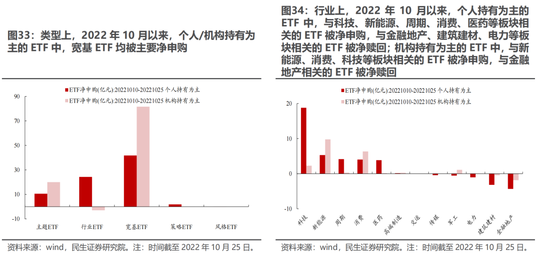 3.2 2022Q3“固收+”基金的新发规模环比小幅回升,同时负债端“赎回”规模环比下降从负债端来看,2022Q3“固收+”基金的新发规模环比小幅回升,而负债端则继续被净赎回,但赎回规模环比下降。此外,“固收+”基金的被赎回数量比例和规模比例同样环比下降:新成立的“固收+”基金规模从2022Q2的233.05亿元小幅回升至2022Q3的384.76亿元,同时2022Q3“固收+”基金整体被净赎回374.45亿元,相较于2022Q2净赎回的1527.16亿元明显下降,且该被赎回的数量/规模占比从2022Q2的69.68%/66.16%下降至64.41%/55.65%。3.3 “固收+”基金的配置方向:主要加仓传统能源、房地产、通信、军工、食品饮料、交运等板块,减仓金融、电新、机械、电子、计算机、医药板块2022Q3“固收+”基金整体主要选择加仓煤炭、房地产、石油石化、通信、军工、食品饮料、交运、建筑等板块,主要减仓金融、电新、机械、电子、计算机、医药等板块。这与主动偏股基金在2022Q3配置方向大体是类似的,这意味着“固收+”基金在2022Q3同样选择挖掘核心赛道之外的领域。从加仓幅度来看,“固收+”基金更多地选择了传统能源、通信等领域。4、2022年10月以来:原有结构在反复中继续松动基于我们的测算,2022Q3以来(截至10月25日),主动偏股基金的仓位震荡回落。基于二次规划法的测算,行业配置上(剔除涨跌幅),主动偏股基金呈现了一定的反复,但整体依然选择减配核心赛道(除了食品饮料),从净值表现对于各类风格板块的归因也能得到相似的结论。负债端层面,如果我们以个人持有为主的ETF作为基民申赎的高频代理变量发现:2022年10月以来,个人持有为主的ETF中,行业上与科技、新能源、周期、消费、医药等板块相关的ETF被净申购,与金融地产、建筑建材、电力等板块相关的ETF被净赎回。同时,2022年10月以来(截至10月25日),主动偏股基金发行情况与三季度相似,被动基金的发行情况则有所回落。这意味着结合仓位来看,当前基金负债端的压力可能相对可控(特别是重仓核心赛道的基金),而基民的行为则存在明显的反复。相对应的是:除了“固收+”以外,10月以来北上资金,特别是其中偏稳定的配置型资金呈现了大幅净流出的情形,仅部分板块(机械、军工、交运、传媒、通信、有色)等板块被净申购。从这个角度看,我们认为,当下外资更有可能是在选择进行大规模切换配置领域,未来市场原有结构的松动在所难免。这意味着的是,市场认知拐点的到来,而内外资可能在反复之中逐步形成共振。对于原先核心赛道而言,未来可能会进一步走向分化,而新的共识正在孕育当中。测算误差:数值模型是对历史的拟合,拟合本身存在误差,另外,统计样本本身也可能造成测算结果的误差。