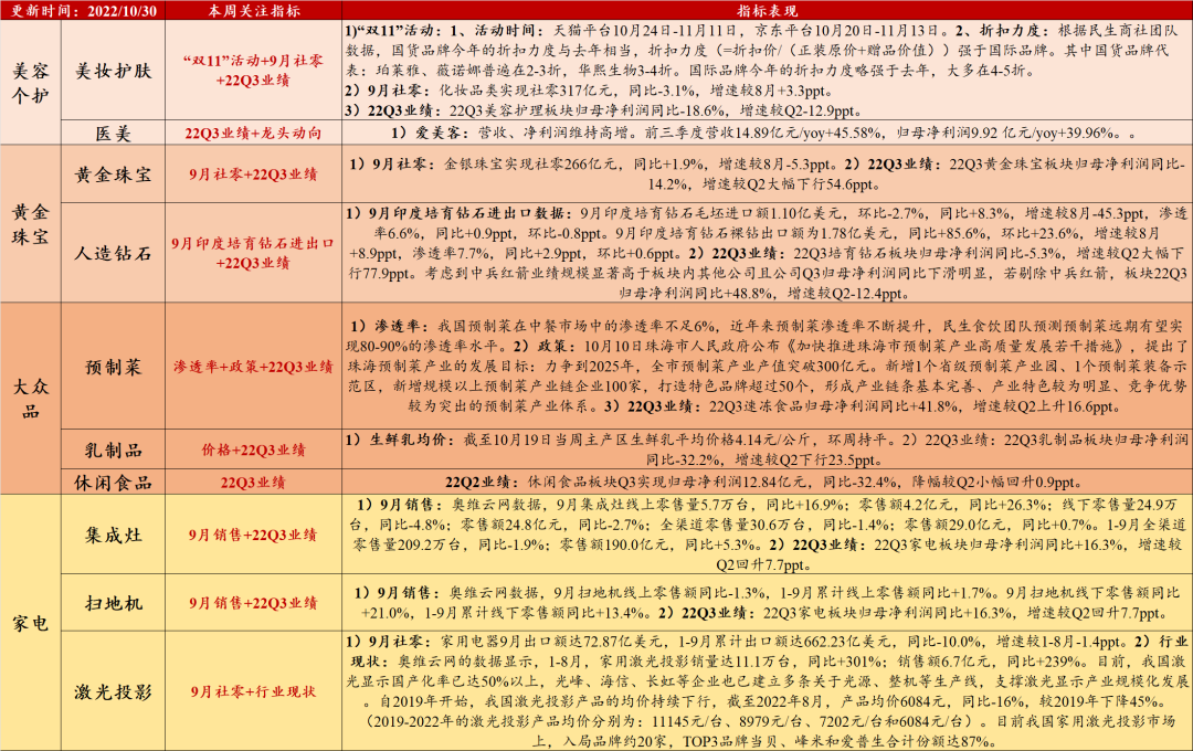 1)Q3业绩:板块中行业表现整体平淡,速冻食品业绩亮眼。22Q3美容护理板块归母净利润同比-18.6%,增速较Q2-12.9ppt;22Q3黄金珠宝板块归母净利润同比-14.2%,增速较Q2大幅下行54.6ppt;22Q3培育钻石板块归母净利润同比-5.3%,增速较Q2大幅下行77.8ppt。考虑到中兵红箭公司业绩对板块的影响较大,若剔除中兵红箭,板块22Q3归母净利润同比+48.8%,增速较Q2下行12.4ppt;22Q3速冻食品归母净利润同比+41.8%,增速较Q2上升16.6ppt;22Q3休闲食品板块实现归母净利润同比-32.4%,增速较Q2小幅回升0.9ppt。