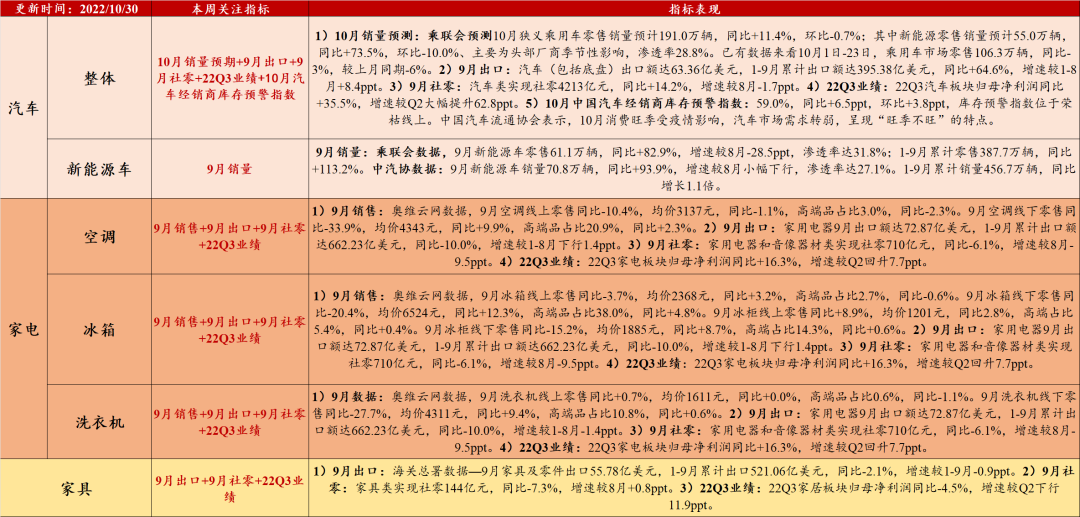 2)汽车:a、10月预测销量边际下行。乘联会预测10月狭义乘用车零售销量预计191.0万辆,同比+11.4%,环比-0.7%。b、10月中国汽车经销商库存预警指数:59.0%,同比+6.5ppt,环比+3.8ppt,库存预警指数位于荣枯线上。中国汽车流通协会表示,10月消费旺季受疫情影响,汽车市场需求转弱,呈现“旺季不旺”的特点。