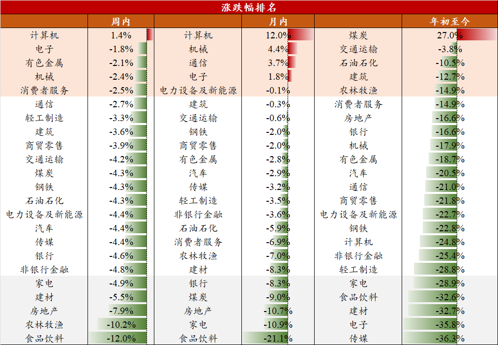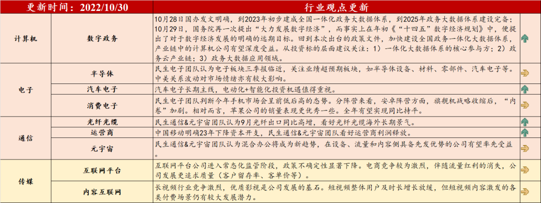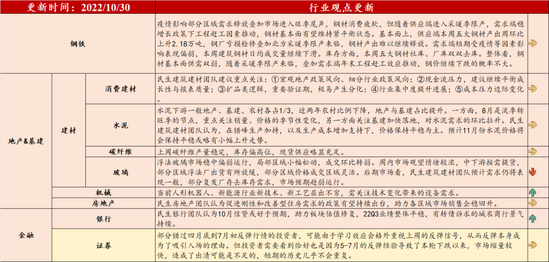 注:1、红底部分的观点来自民生行业团队,黄底部分的观点来自民生策略团队。2、最右边栏箭头表示细分行业基本面较上周的表现,箭头向上代表行业基本面环比上周走强,箭头向下代表行业基本面环比上周走弱,箭头水平则代表行业基本面较上周持平。