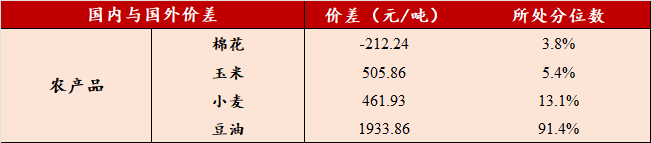 国内外价差:1)煤炭板块:动力煤(国内-海外)价差-760.71元/吨,维持稳定,处于2012年以来的3.9%分位数。焦煤(国内-海外)价差继续下行至458.91元/吨,处于2012年以来的74.4%分位数。2)金属板块:上周铜、铝(国内-海外)价差维持稳定,分别为8670.96元/吨和2652.23元/吨,处于2012年以来的93.7%、78.2%分位数。镍(国内-海外)价差继续上行至27282.29元/吨,处于2012年以来的100.0%分位数。3)农产品板块:上周棉花(国内-海外)价差维持稳定,玉米、豆油(国内-海外)价差下行,小麦(国内-海外)价差继续上行。上周棉花价差维持在2012年以来的3.8%、分位数;玉米、豆油价差下行至505.86元/吨、1933.86元/吨,处于2012年以来的5.4%、91.4%分位数;小麦价差继续上行至461.93元/吨,处于2012年以来的13.1%分位数。