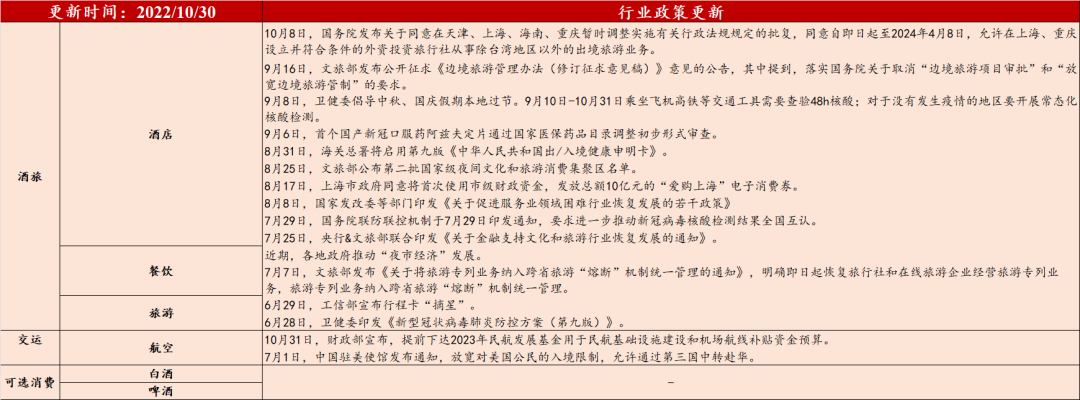 3)航空:多家航空公司陆续恢复国际航线。a、东航:东方航空在官方微博宣布,计划于10月底恢复多条国际航线,包括上海-曼谷-青岛、杭州/青岛/南京/昆明-东京成田、青岛/南京/烟台-首尔仁川、青岛-迪拜等航线。自2022年10月30日冬春航季开启后,东航计划每周客运国际航线将增至42条108班。b、南航:计划10月起恢复广州-雅加达、大连-东京成田航线。同时,在广州-迪拜等航线上增班。c、海南航空:计划10月30日冬春航季开启后继续运营10条往返国际客运航线,同时将重庆—罗马国际航班增至每周2班。d、春秋航空:10月13日宣布新开多条港澳、国际航线。e、国航:9月29日发布消息称将恢复北京—马尼拉/雅加达/东京/华沙/雅典、深圳—洛杉矶、成都—雅加达等多条国际航线。除此以外,天津机场将复飞首条中泰航线,中国与新加坡两国间的航班量预计将在11月底前恢复至每周30班。