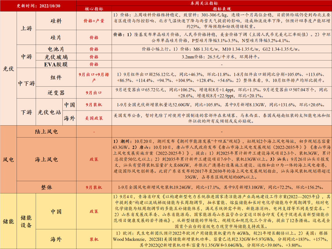 3)光伏:a、硅片:隆基价格稳定、中环小幅降价。近期,隆基和中环公布单晶硅片价格。其中隆基发布的单晶硅片价格:人民币价格持稳,美金价格下调(主因人民币兑美元汇率贬值)。中环公布的单晶硅片价格:P型硅片降幅3.1%-3.5%,N型硅片降幅3.2%-4.1%。b、新增装机:9月光伏新增装机量维持高增长。1-9月全国光伏新增装机量达52.60GW,同比+105.8%,其中9月新增8.13GW,同比+131.6%,环比+20.6%。