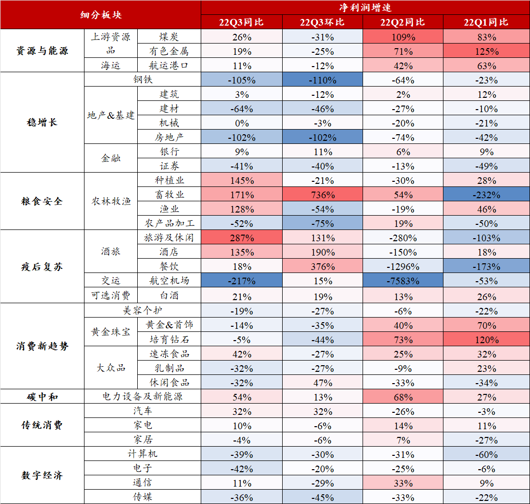 1)Q3业绩:粮食安全板块业绩显著修复、疫后复苏板块表现分化,能源与资源板块增速高位回落。