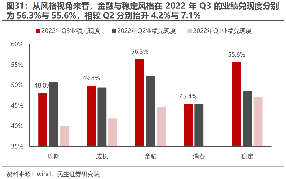 而从风格视角来看,金融与稳定风格在2022年Q3的业绩兑现度分别为56.3%与55.6%,相较Q2分别抬升4.2%与7.1%。其中公用事业、银行的2022年Q3业绩兑现度高达63.2%与58.1%,是相关风格强业绩兑现能力的主要贡献。相较而言,周期相较Q2略下滑2.7%,而消费、周期与成长则变化并不明显。