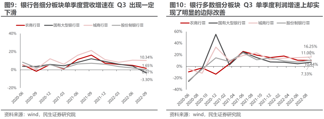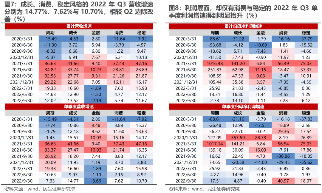 从风格视角来看,成长、消费、稳定风格的2022年Q3营收增速分别为14.77%、7.62%与10.70%,相较Q2边际改善。然而利润层面,却仅有消费与稳定的单季度利润增速得到明显抬升。而对于金融风格而言,尽管单季度营收增速出现边际下滑,然而其利润增速却相较Q2依然实现了弱改善。结构上看,地产营收降幅出现了一定收敛,然而其利润增速下滑至-100%以上,板块仍处于至暗时刻。而相较之下,尽管银行各细分板块营收增速出现一定下滑,其Q3单季度利润增速上却实现了明显的边际改善(股份制银行、国有大型银行、城商行等)。对于非银板块而言,在Q2景气度短暂修复的保险、券商在Q3营收与利润增速纷纷大幅下滑,再度陷入困境,而租赁、信托、资管等方向的业绩则较为出色。