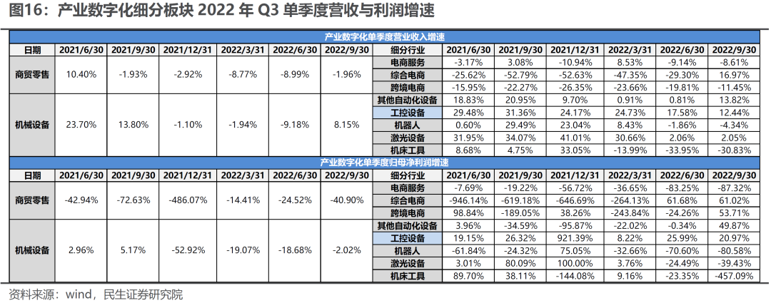 为刻画数字经济产业链的景气度,数字产业化我们主要跟踪计算机、电子、通信、传媒(数字媒体、游戏)板块与的业绩表现;产业数字化则跟踪工控自动化(表征制造业数字化)与商贸零售(互联网电商,表征服务业数字化)的业绩表现。整体而言,数字板块在Q3的业绩表现依然不佳,所有的大类板块(通信、电子、计算机、传媒)的单季度利润增速均出现较大幅度的下滑。然而曙光也似乎正在出现:计算机、电子与传媒的营收增速相较Q2均出现了一定的边际改善尽管幅度相对有限且持续性尚待观察,然而这一定程度上也意味着下游需求底似乎已经出现。结构上看,半导体设备、通信设备的单季度利润增速分别达到了114.47%与90.66%,表现相对亮眼;而消费电子板块在Q3单季度的营收与利润增速分别为26.12%与25.53%,业绩改善力度明显。![]()