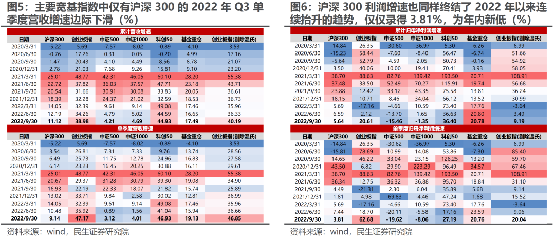 结构上看,主要宽基指数中仅有沪深300的2022年Q3单季度营收增速边际下滑,并且利润增速也同样终结了2022年以来连续抬升的趋势,仅仅录得3.81%,为年内新低。由于沪深300成分股与宏观经济的相关性显著,其相对偏弱的业绩表现恰是体现了下行的宏观总量需求在微观上市公司层面的映射。相较之下,成分股大多来源于新兴产业的创业板指与科创50指数的2022年Q3业绩表现则较为出色,其Q3单季度营收/利润增速分别高达47.17%/62.68%,46.93%/27.19%,即使在剔除温氏股份后,创业板指依然录得46.85%与20.04%的营收与利润增速,景气复苏相对明显。而从大小盘风格上来看,以中证500、中证1000为代表的中小盘股在Q3的单季度营收/利润同比增速分别为3.12%/-19.62%,4.01%/-8.06%,仍然处于困境之中。创业板指/科创50与中证500/中证1000之间的景气度分化或表明:即使投资者关注宏观经济下行环境中部分新兴产业的结构性增长,也应当留意可能存在的景气由龙头公司(以创业板指、科创50成分股为代表)向中小公司扩散速度不及预期的风险。![]()